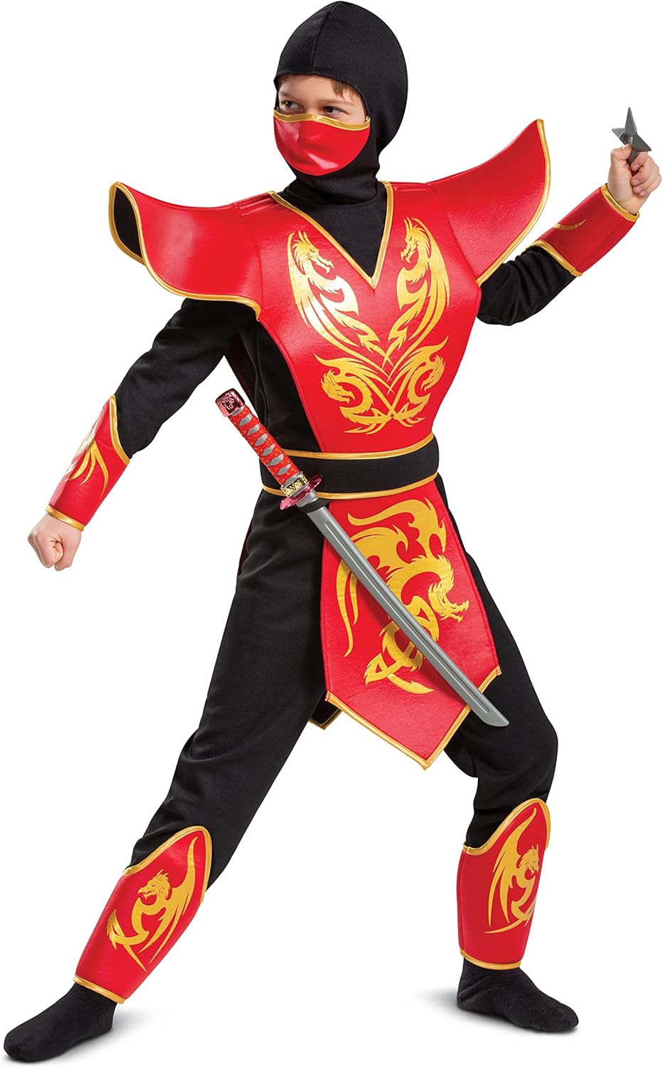Kid's Red Ninja Halloween Costume, Samurai Warrior Outfit with Plastic Sword & Plastic Throwing Star Accessory