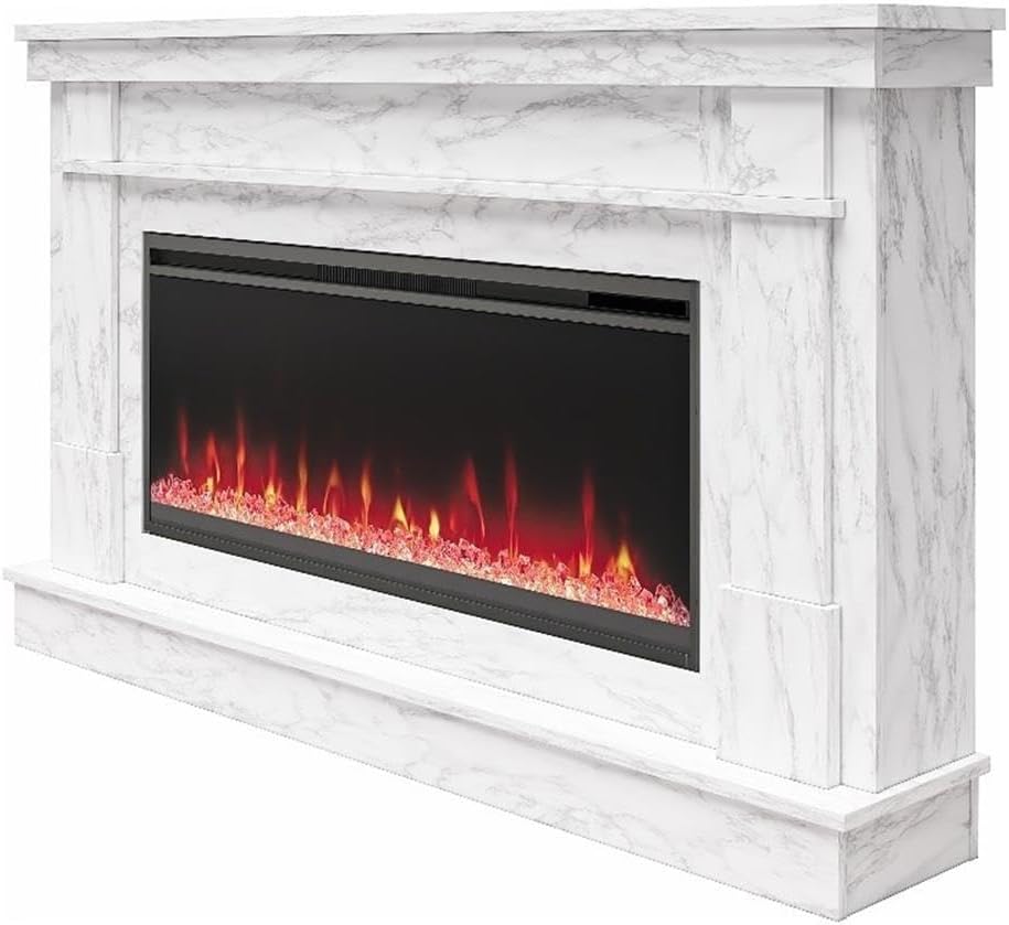 Novogratz Waverly 64 Inch Electric Fireplace with Mantel, Replaceable Fireplace Insert Heater, Remote Control, Timer, Color Changing Crystal Ember Flames, For Living Room or Bedroom, White Marble