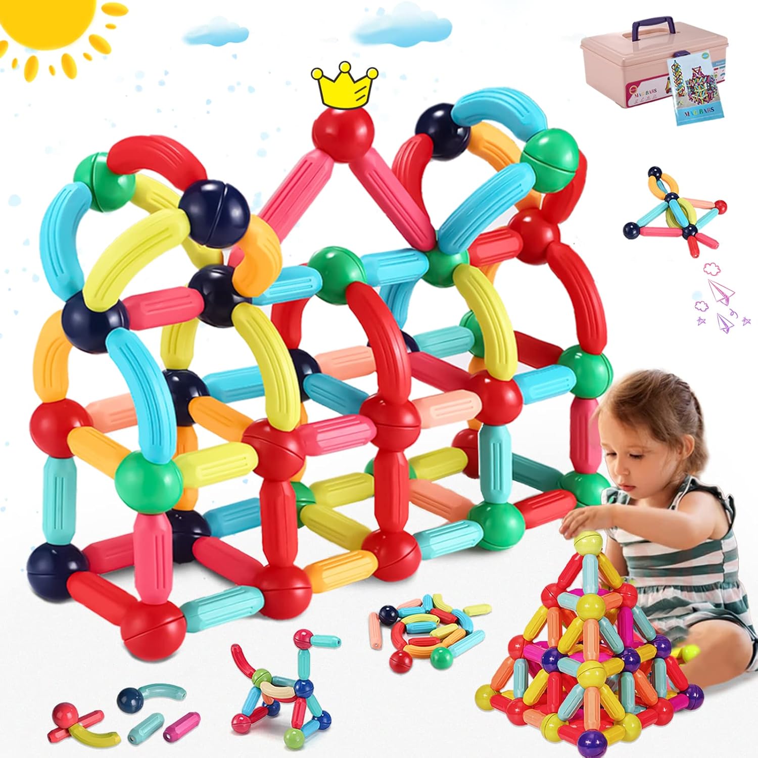 【Durable and Safe Magnetic Building Toys】The magnetic building sticks set is made of bright, colorful, environmentally High-Quality ABS Plastic which is certified as Phthalate, Lead, Cadmium, and BPA-free! All parts are larger than 1.4 feet and designed with rounded edges, making it a safe starter toy for toddlers and children to play with.