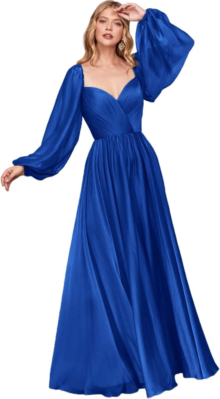 Vestido de dama de honor Kibbih de manga larga para mujer, chifón plisado, corte A, hombros descubiertos, vestido de fiesta formal de noche
