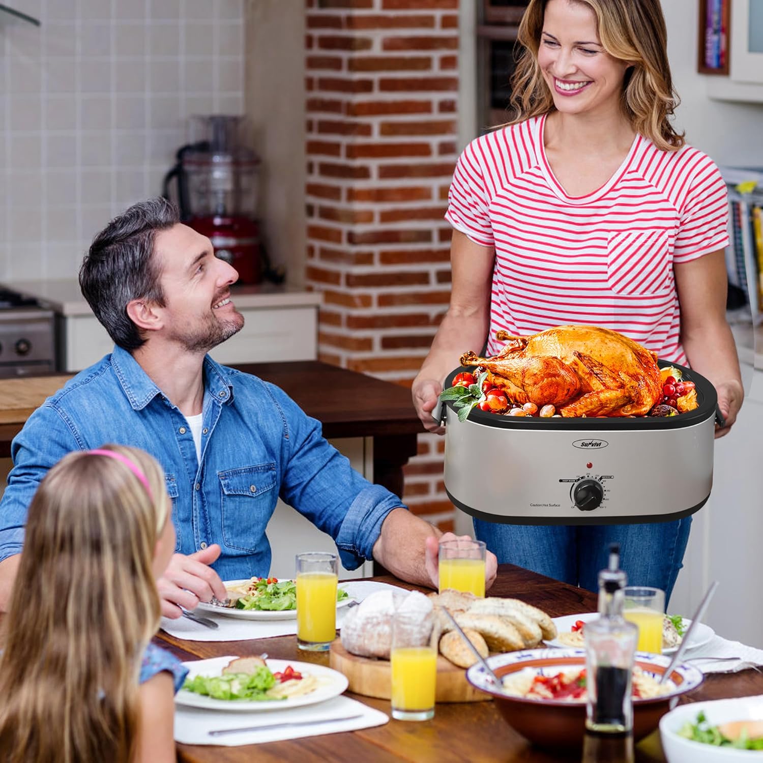 Sunvivi 20 Quart Electric Roaster Oven Turkey Roaster with Lid Electric Roasters with Removable Pan Large Roaster, Self-basting Lid, Fast Heating & Thaw/warming Setting, Silver
