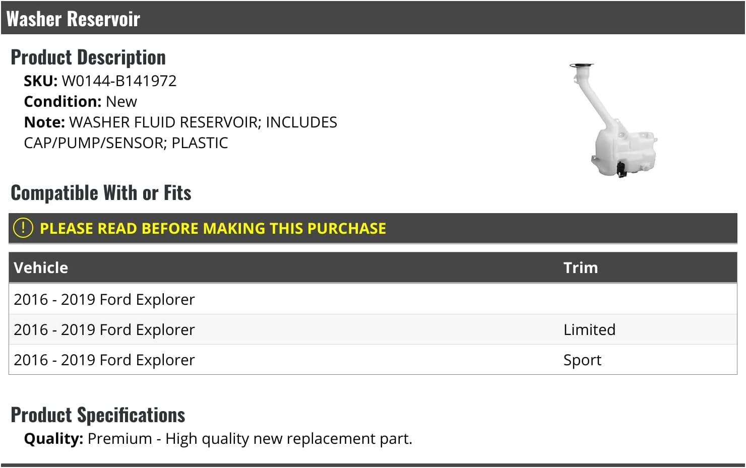 Depósito de líquido para limpiaparabrisas - con tapa, bomba y sensor - Compatible con Ford Explorer 2016-2019 (W0144-B141972)