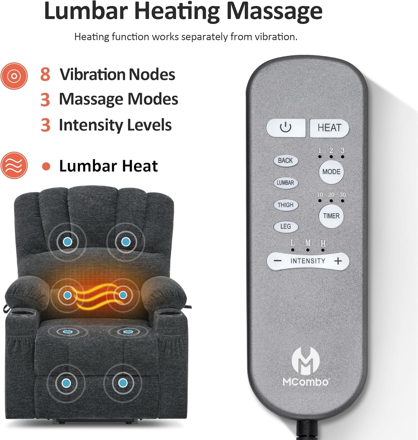 MCombo Power Lift Recliner Chair for Elderly, Lift Chair with Heat and Massage, USB &Type C Ports, Cup Holders, Fabric 7095 (Medium, Dark Grey)