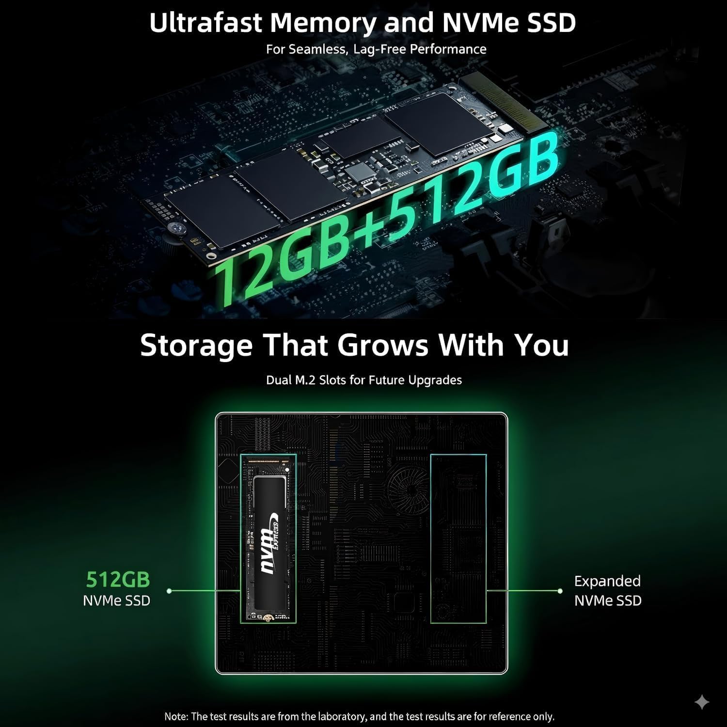 ➤ 【Effortless Performance for Work & Play】 Powered by the Intel Core i3-1000NG4 processor(up to 3.2GHz), lag-free performance, 12GB of LPDDR4 RAM and a lightning-fast 512GB NVMe SSD, this mini PC handles everyday tasks, streaming, and multitasking with ease. Easily expand your storage up to 2TB with dual NVMe slots and an included SATA cable for a 2.5” drive.