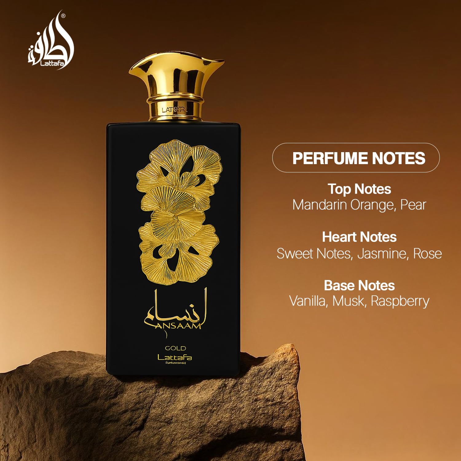 Lattafa Ansaam Gold es una fragancia comercializada como perfume unisex. Es producida por Lattafa, una empresa con sede en los Emiratos Árabes Unidos que se especializa en perfumes y fragancias. Según la descripción del producto, Lattafa Ansaam Gold presenta una combinación de aromas florales y maderosos. Las notas de salida de la fragancia incluyen bergamota, limón, lavanda y pimienta rosa. Las notas de corazón incluyen jazmín, rosa e iris, mientras que las notas de fondo presentan pachulí, cedro, ámbar y almizcle. La fragancia resultante se describe como cálida, especiada y lujosa, con un fuerte sillage y una duradera persistencia.