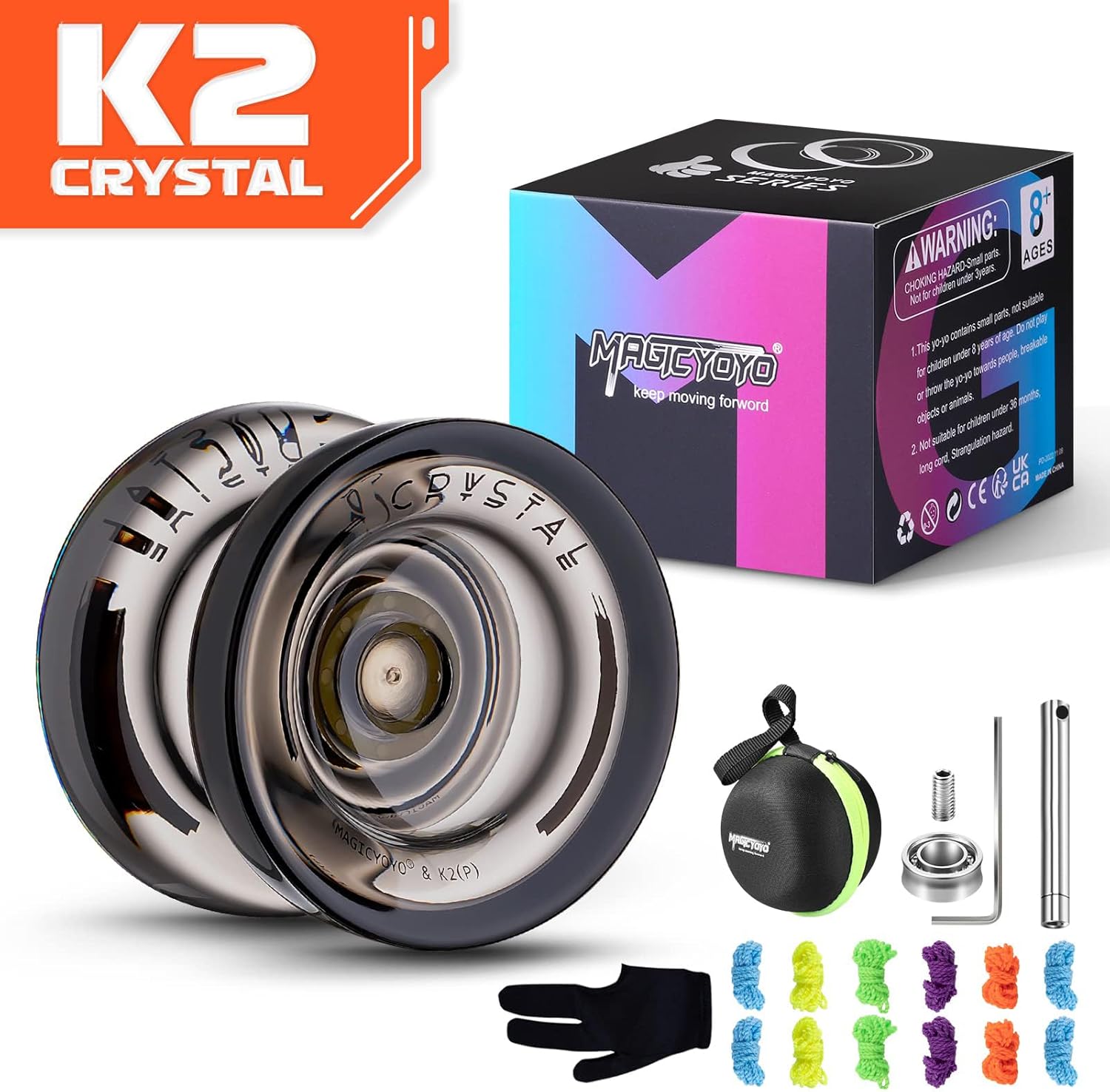 👍 PAQUETE YOYO DE VALOR - Incluye 1 x MAGICYOYO K2 Negro Cristal, extra 12 x Cuerdas de yoyo (color aleatorio), 1 x Bolsa de almacenamiento de yoyo, 1 x Herramienta profesional para retirar rodamientos, 1 x Rodamiento KK (Rodamiento No Sensible), 1 x Eje M4*10mm (para no sensible), 1 x Guante.
