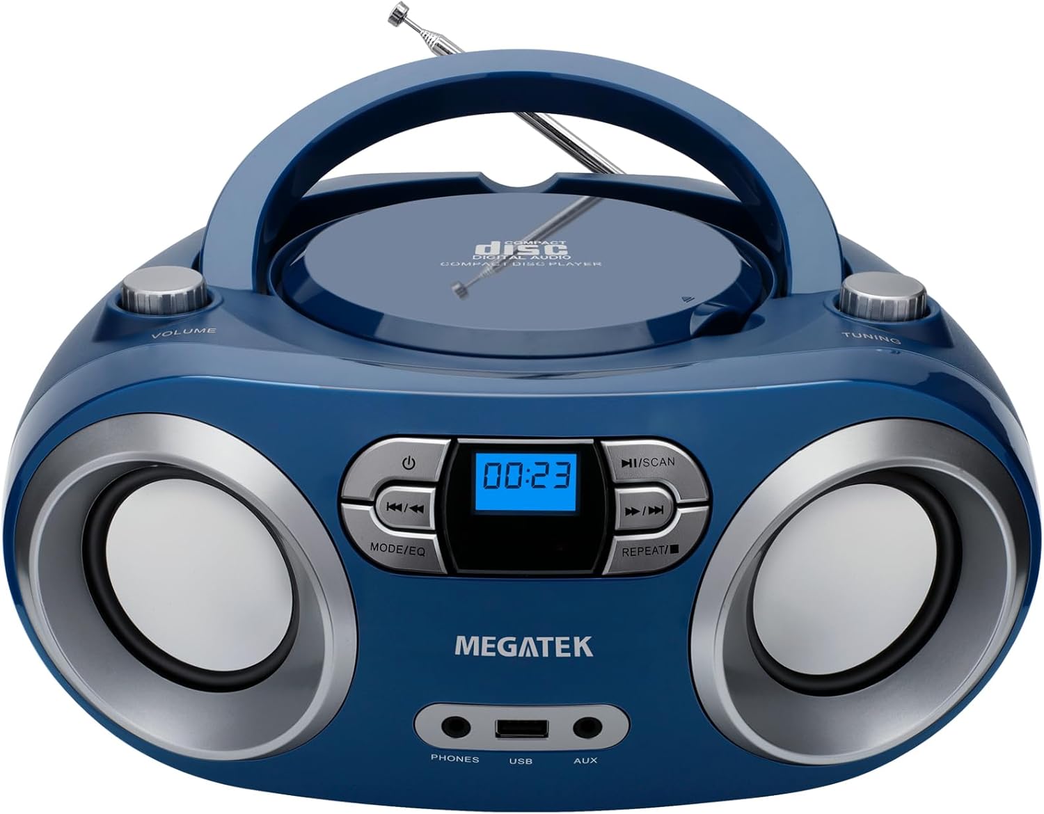 Reproductor de CD estéreo portátil MEGATEK Boombox con radio FM, Bluetooth, USB, entrada auxiliar y conector para auriculares, compatible con CD-R/RW y CD MP3, sonido claro y equilibrado, funciona con corriente alternativa/pilas, Blue Jay
