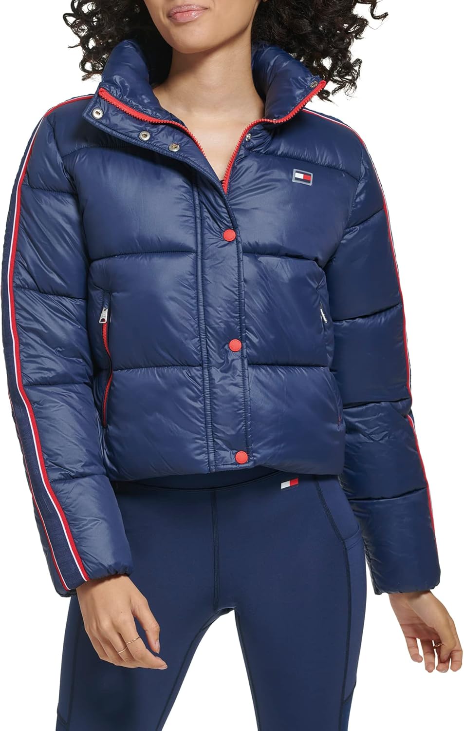 Chaqueta acolchada Tommy Hilfiger para mujer, de corte corto, bolsillos con cremallera, logotipo, con cinta adhesiva en las mangas