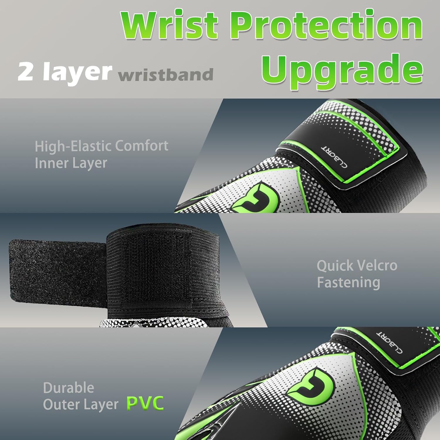 Dual Wrist Protection: The wristband of our soccer goalie gloves are composed of inner woven elastic band and outer adjustable Velcro, aiming at better fitting and safeguarding your child’s wrists from injuries during training or games. Children do not need to worry about goalie gloves falling off during actions.