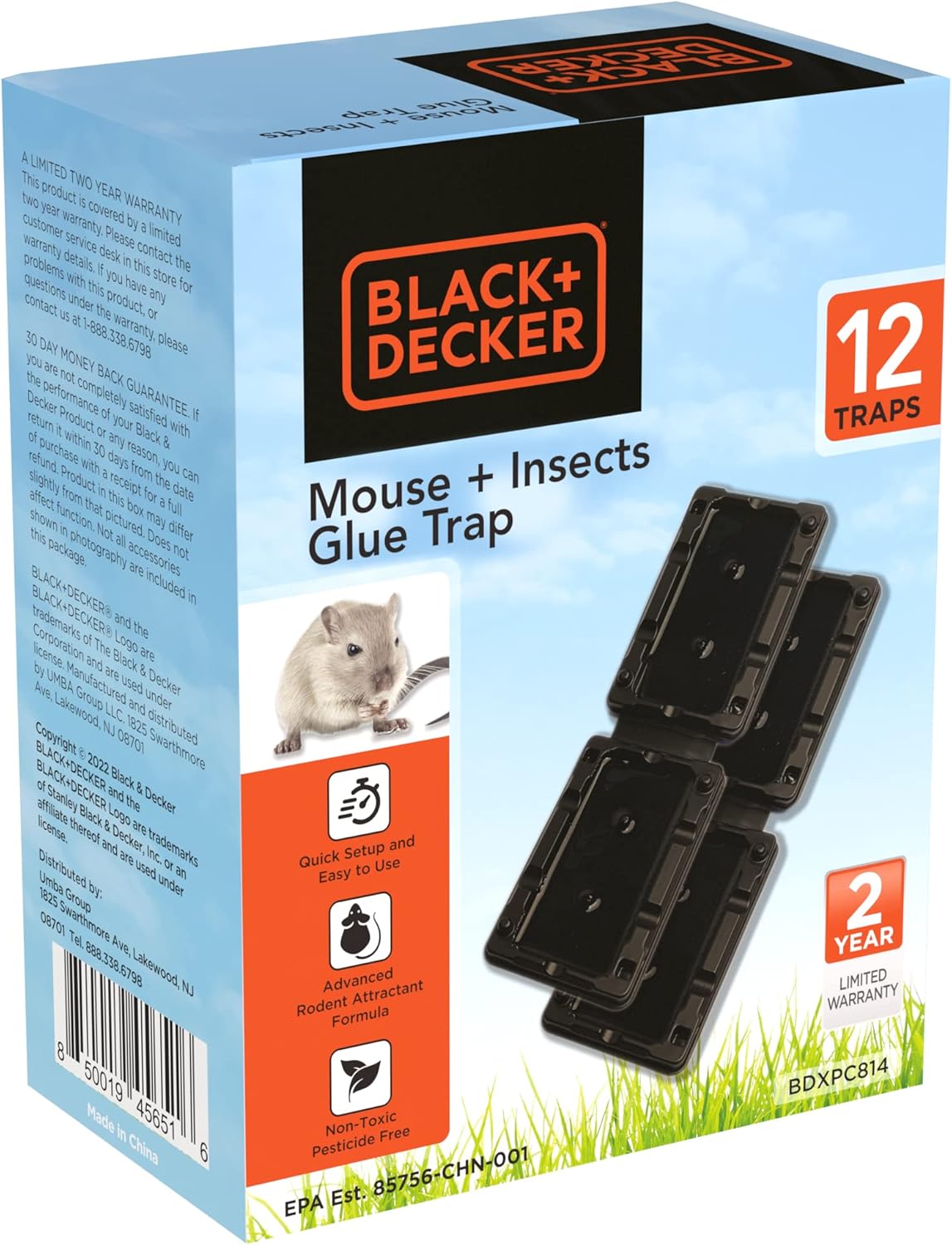 BLACK+DECKER Glue Traps for Mouse & Insect- Heavy- Duty Sticky Traps for Mice, Small Rats, Flies, Cockroaches & Other Bugs- Eco Friendly, Odorless Pest Remover- 12 Pack, Black