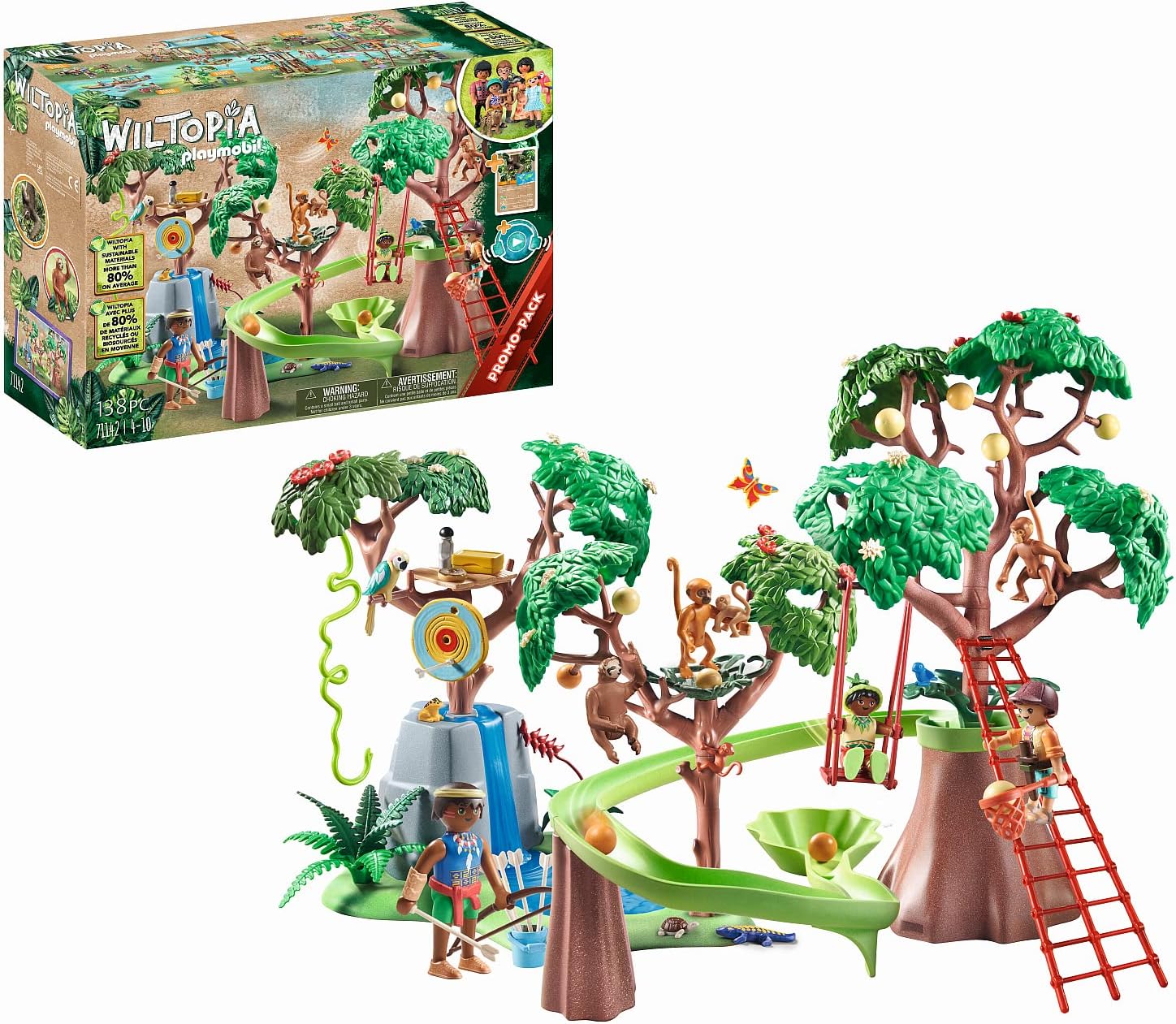 ¡Llamando a todos los jóvenes exploradores al Wiltopia: Parque de Juegos de la Selva! Escala la escalera de cuerda para cosechar la fruta de los árboles, enviándola por la pista hasta el suelo de la selva debajo. Practica tus habilidades con el arco y la flecha y trata de acertar al blanco o obtén una vista aérea del bosque desde la plataforma de observación. En lo alto de los árboles, los monos están balanceándose mientras el perezoso se mueve lentamente por los árboles. Usando la tarjeta animal coleccionable incluida con la aplicación Wiltopia, los niños pueden aprender todo sobre los animales y sus hábitats e incluso tomarse una selfie con ellos proyectando los animales directamente en su hogar a través de la realidad aumentada (AR). Con Wiltopia - la línea de productos ecológicos de PLAYMOBIL que consta, en promedio, de más del 80% de materiales sostenibles - los niños pueden embarcarse en aventuras a regiones vibrantes alrededor del mundo, fomentando una apreciación por la vida silvestre que vive allí y nuestro planeta en general. Juega con este set por sí solo o combínalo con el resto del tema Wiltopia (#71048-71074, 71007-71012, 71143 - vendidos por separado) para aún más diversión salvaje con animales! El set incluye una figura de adulto, dos figuras de niños, perezoso, monos, cocodrilo, tortuga, rana y otros accesorios. Recomendado para niños de cuatro a diez años. Advertencia. Riesgo de asfixia. Pelota pequeña y piezas pequeñas. No para niños menores de 3 años