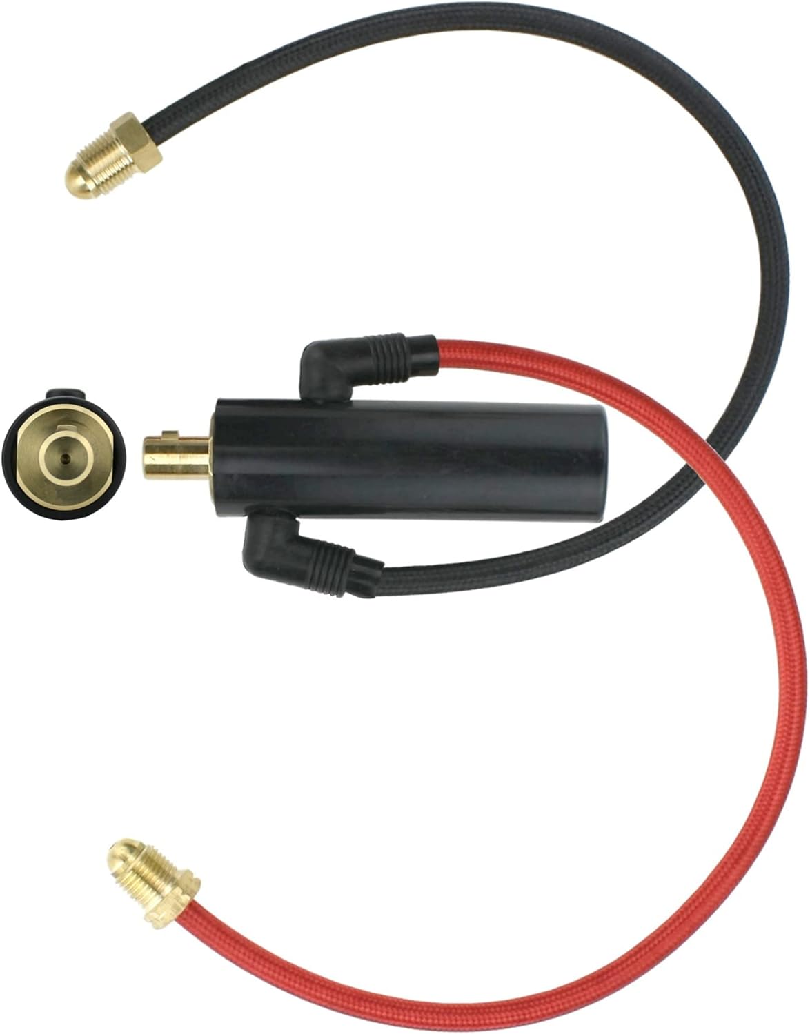 High-quality INLINE Dinse 35-70 Plug with 18" returning water hose with 5/8"-18 LH connector and 18" Argon Hose with 5/8"-18 RH connector Check the pictures with dimensions and compare them with your existing Torch Cable and Welder´s Plug Receptacle. Check the table with a list of the most common welders compatible with this type of inline connector. This Dinse connector is used ONLY on Water-Cooled TIG Torches, (Models 20 and 18). It will not fit Air-cooled torches of any kind. This Dinse connector is used ONLY with Welders with gas solenoid and Inline gas pass through the connector plug.