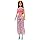 La muñeca Barbie tiene el pelo castaño liso y lleva un traje de baño estampado de cebra rosa metálico — el bañador de una pieza se transforma en un top de cuerpo entero cuando se combina con los pantalones o la falda incluidas.