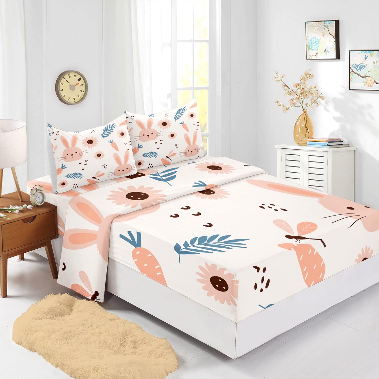 CVHouse Kawaii Bed Set Sheets Queen Size,Kawaii Rabbit Bedding Sets for Girls Kids Teens,Cute Rabbit Fitted Sheet Sets,1 Flat Sheet & 1 Fitted Sheet with 2 Pillow Cases - 4 Pieces