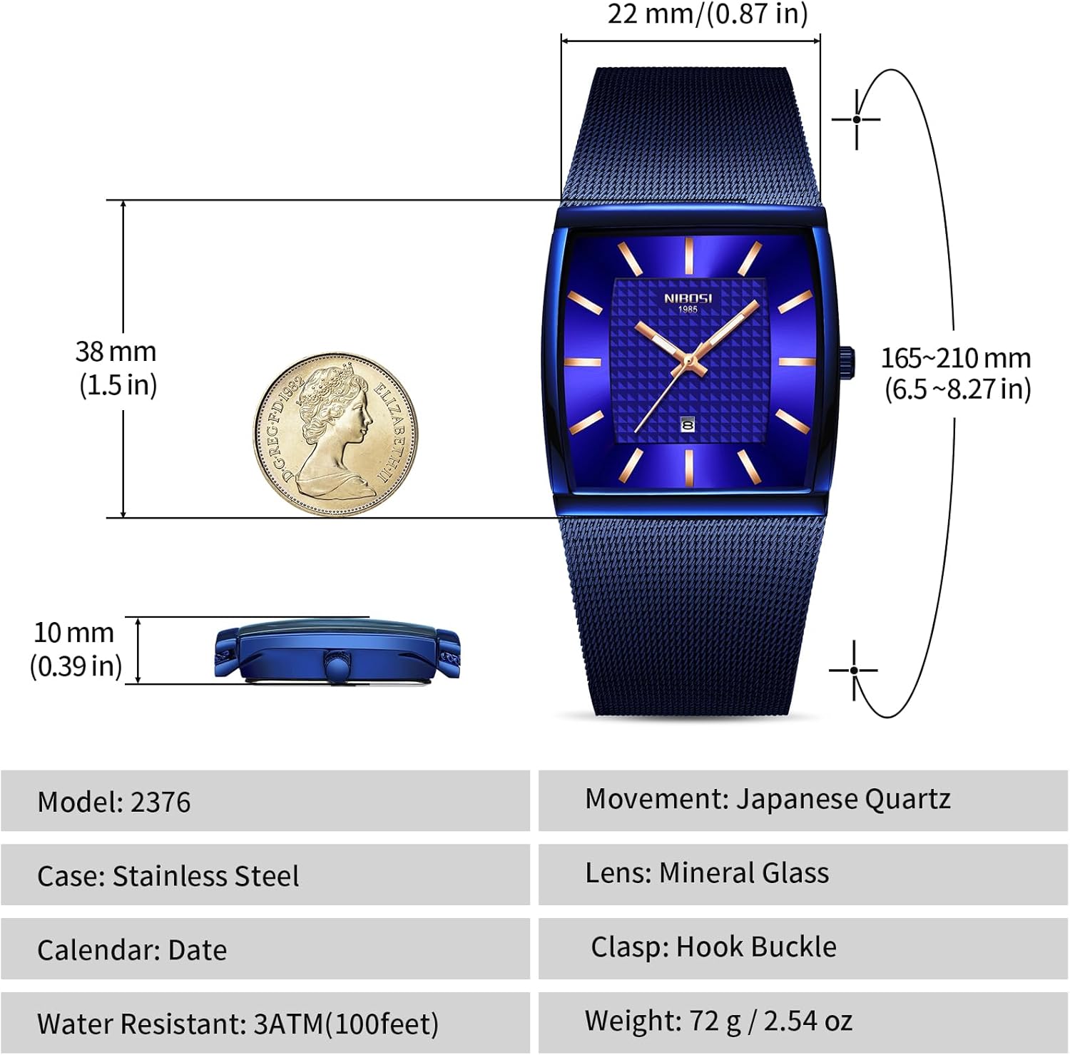 NIBOSI Men Watches Square Analog Quartz Stainless Steel Watches for Men Mesh Strap Waterproof Business Military Sport Wrist Watch with Date