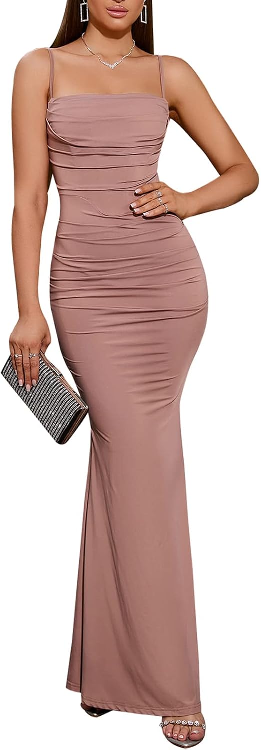 EYNMIN Women's Sleeveless Bodycon Corset Maxi Dress Spaghetti Strap Ruched Elegant Evening Wedding Guest Long Formal Dresses