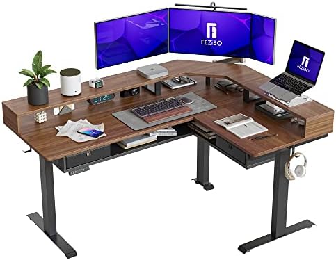 FEZIBO L Shaped Standing Desk with LED Strip & 2 Drawers, Triple Motors Supports Over 300lbs, Upper and Lower Storage Shelves Available, Electric Height Adjustable, for Home Office, Black Walnut