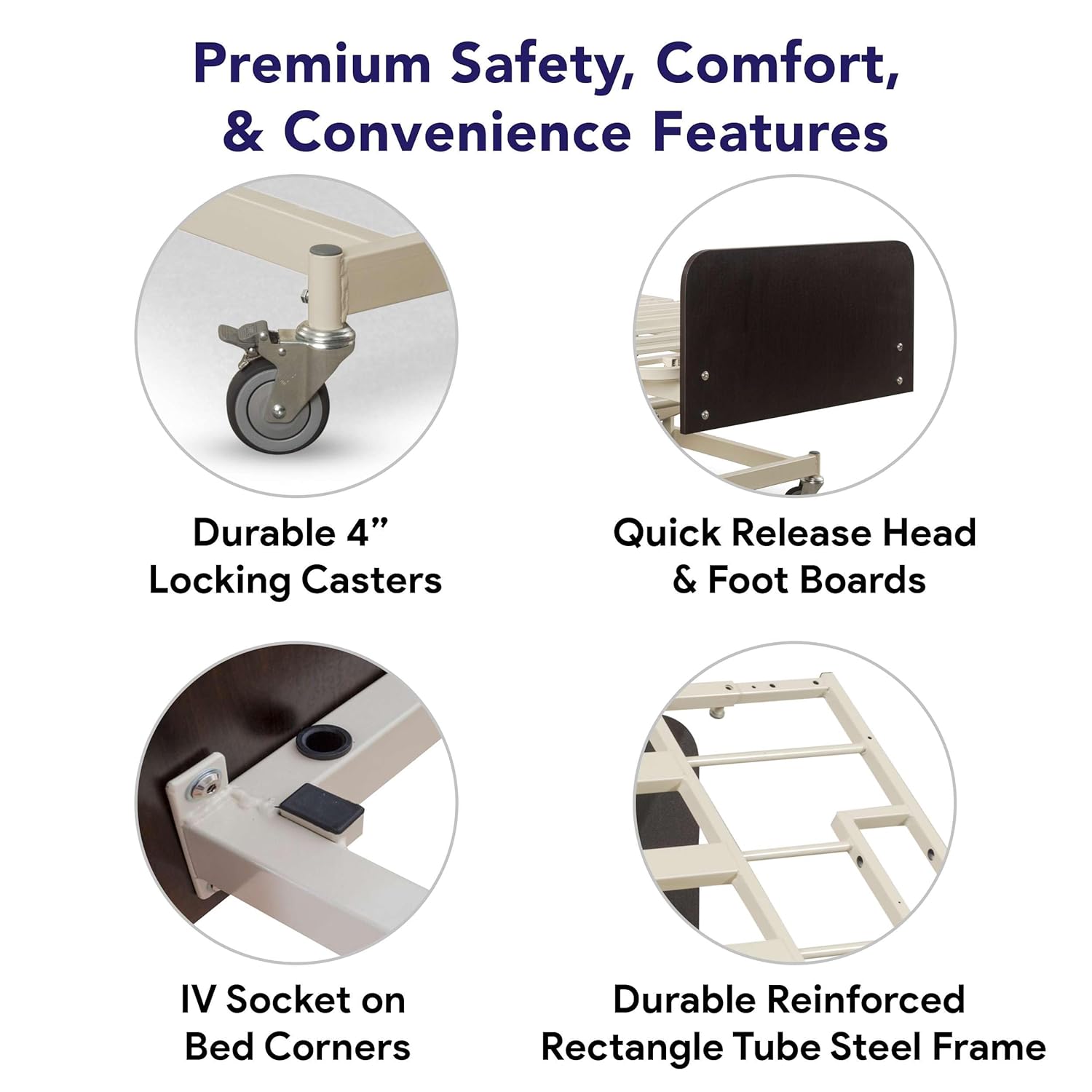 AWESOME FEATURES: This fully electric motorized hospital bed has loads of great features, including the adjustable bed frame, 8 function hand pendant remote controller, quick-release head and foot boards, and corner mattress retainers.