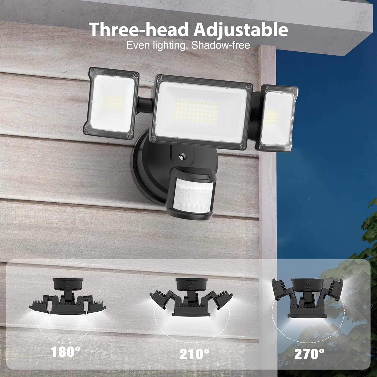 Light Up the Wider Area: Triple-headed motion lights for outside illuminate up to 1150ft², reducing shadows and blind spots. With 270-degree adjustable coverage, these lights enhance home security and deter potential intruders