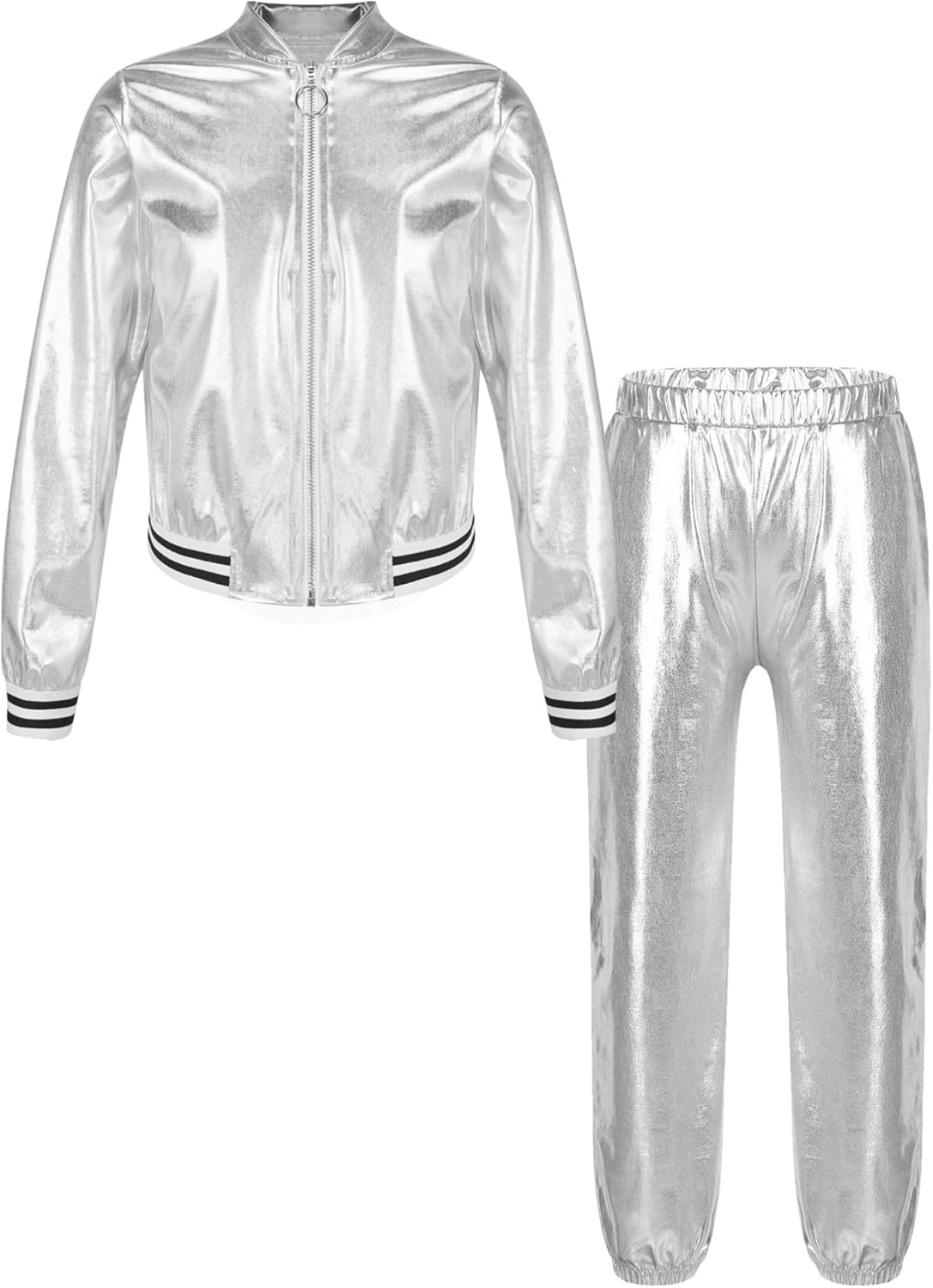 TiaoBug Kids Boys Girls Jazz Hip Hop Dance Costume Shiny Metallic Long Sleeves Bomber Jacket and Pants Dancewear Set