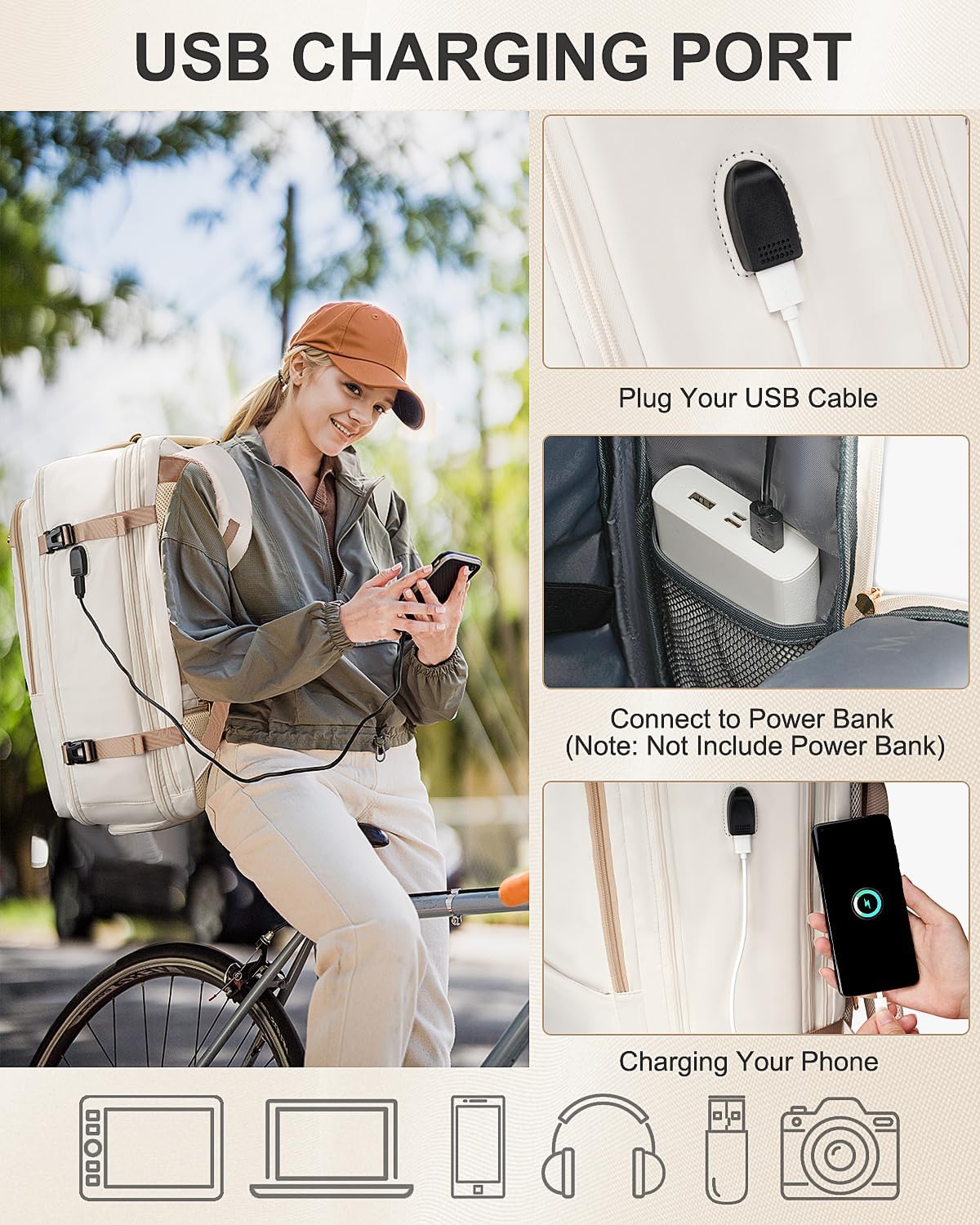 Functionality & Safety: Expandable travel backpack with USB charging port and built-in cable makes it easy to charge your phone while walking or riding. Note: POWER BANK is not included. A luggage strap attaches the weekender travel backpack to the handle of rolling luggage for hands-free transport and easier carrying. A hidden anti theft pocket on the back of suitcase backpack for women protects wallet and passport. Womens travel backpack for travelers to protect property and privacy