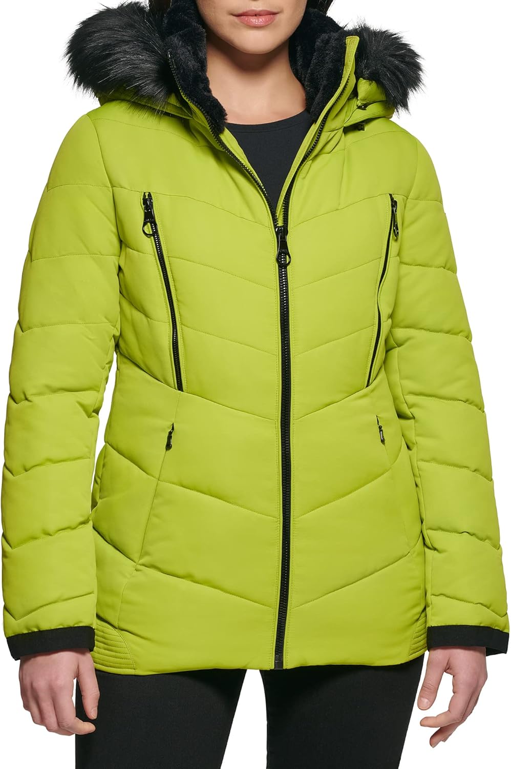 This GUESS Women's OUTERWEAR puffer is a cold weather short casual hooded coat
