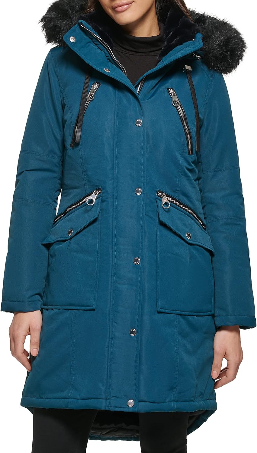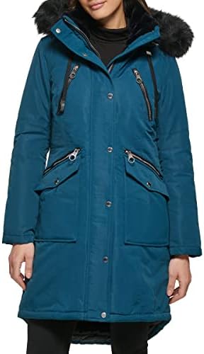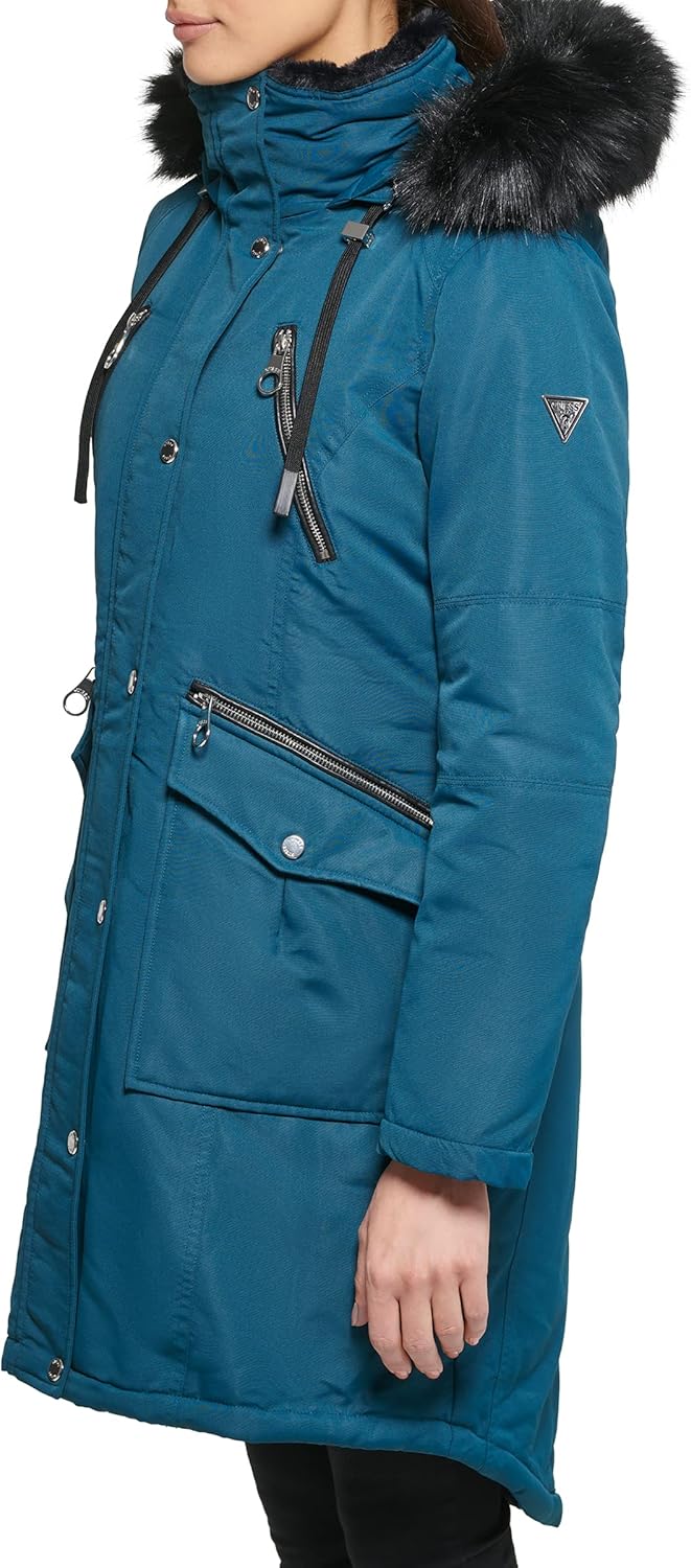 This GUESS Women's OUTERWEAR parka is a long hooded cold weather anorak coat
