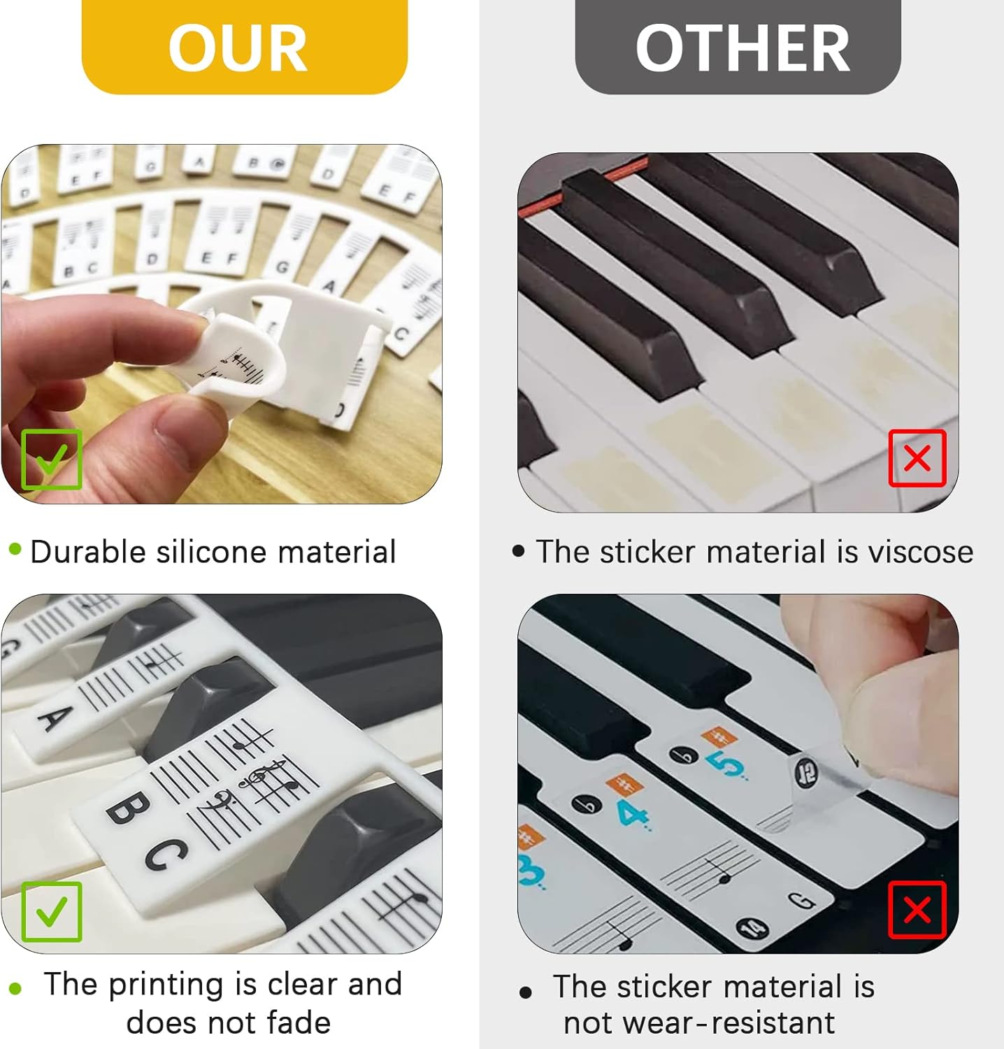 【No Glue, Removable】Our piano keyboard stickers are made of high quality flexible silicone, not too thick, easy to remove and rearrange, no glue needed, they fit the keys without any interference and the labels are just the right length to have no effect on your playing.