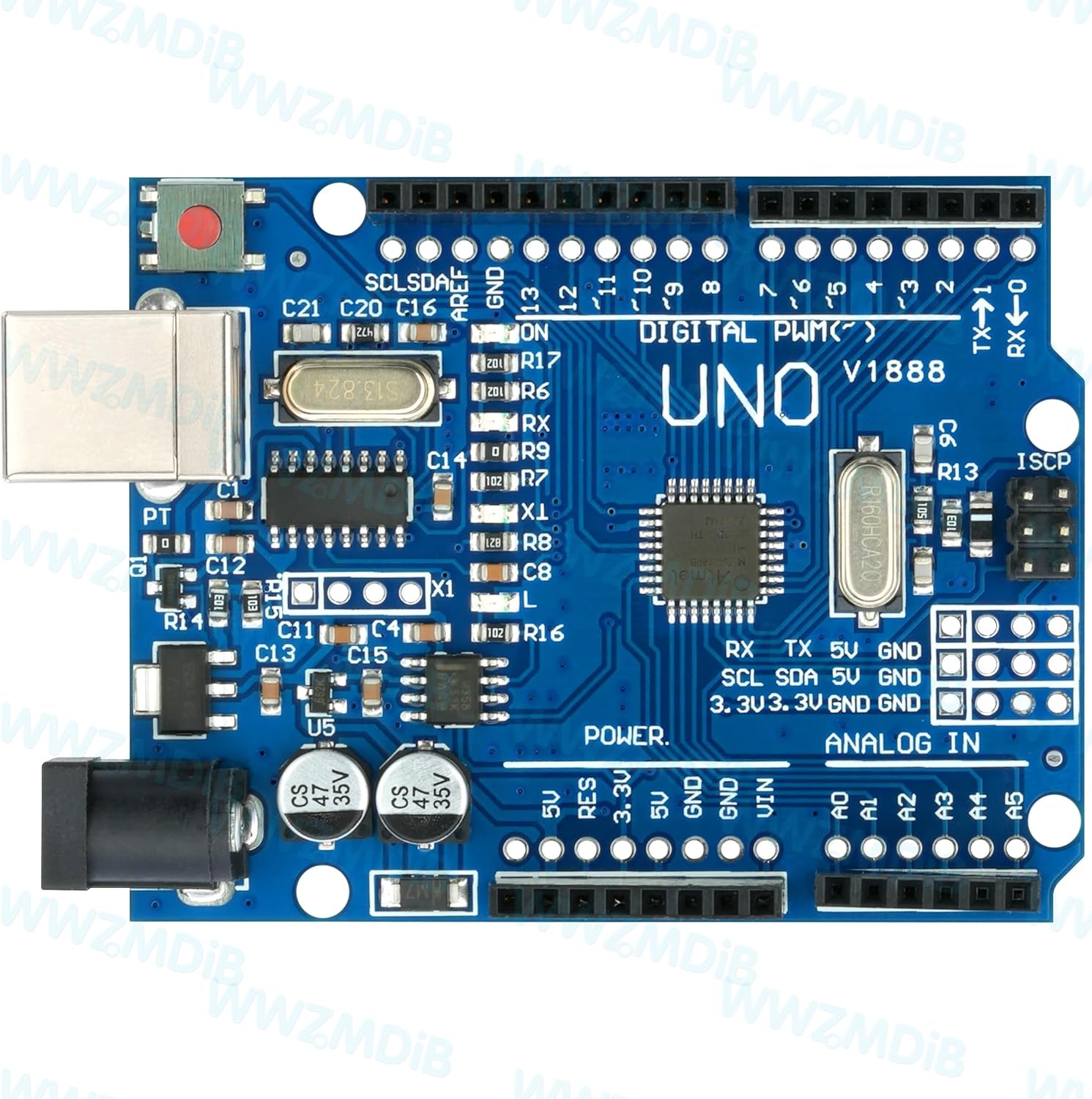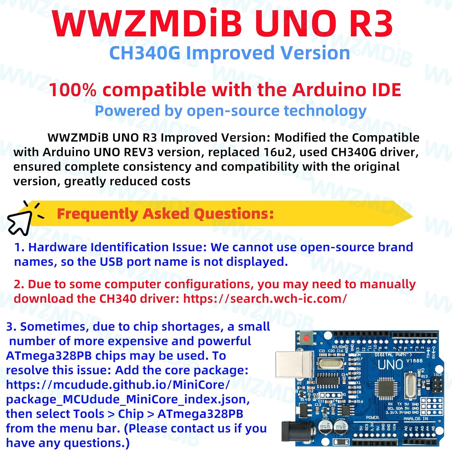 WWZMDiB UNO R3 Board Versión mejorada: Modificada la versión compatible con Arduino UNO REV3, reemplazó el 16u2, usó el controlador CH340G, aseguró la completa consistencia y compatibilidad con la versión original, redujo enormemente los costos