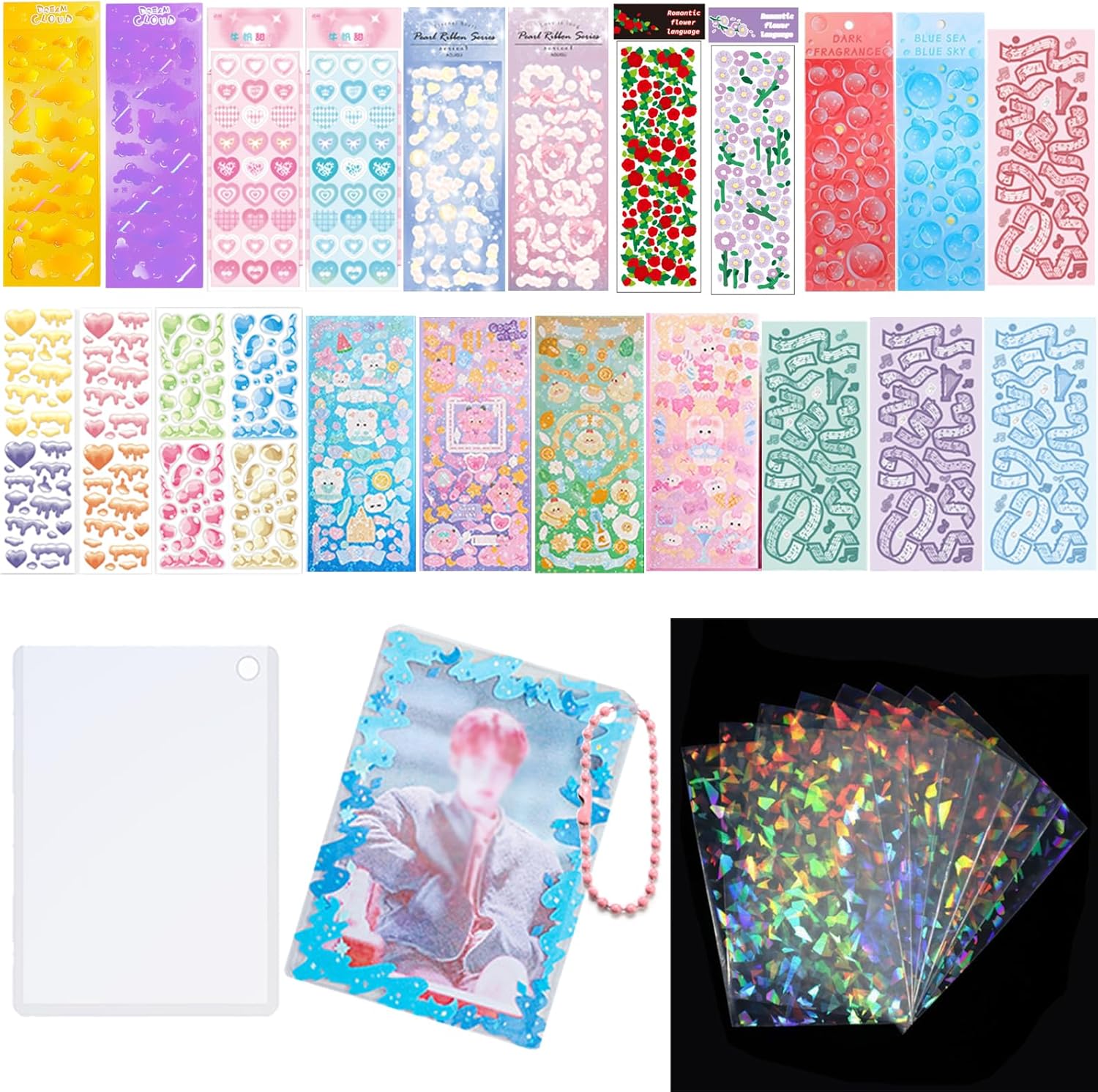DIY Photocard Protector Kit-50 heart holographic photo card sleeves, 6 pieces hard card holder keychains with film, 22 sheets colorful cute Kpop photocard stickers (you will receive picture 1 or 2 at random) deco of different patterns and styles such as Alphabet, bowknot, rainbow, bubble, heart, ribbon, star, daisy, leaves, butterflies and so on, sufficient quantity and style will meet your needs for scrapbooking, crafting, photocards binder album and other DIY