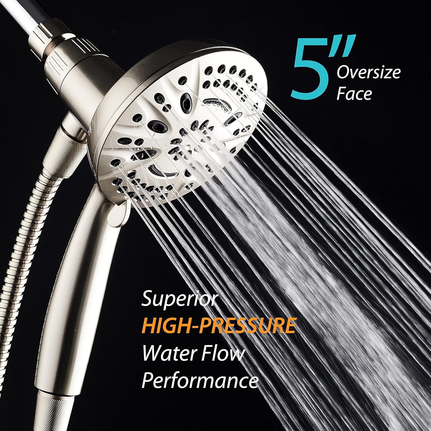 HIGH-PRESSURE GIANT 5 INCH HEAD - Advanced 4-zone Click Lever Dial delivers water flow with an amazing power and precision. Its Extra-large 5” Face provides drenching shoulder-to-shoulder flow coverage, while Rub-clean Jets help protect nozzles from clogging. So you get a fuller, more powerful and efficient shower every time, even if your home has low water pressure!