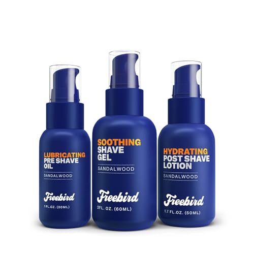 indulge in the Freebird Sandalwood Shaving Bundle for the ultimate grooming experience. Begin with the Smooth Start of our Pre-Shave Oil, specially crafted for electric shavers to hydrate and protect. Follow with the Ultra-Slick Shave Gel, designed for sensitive skin, creating a protective layer for a seamless glide. Conclude your ritual with the Refreshing Finish of our Aftershave Lotion, offering a cooling sensation and long-lasting moisture. All three products boast a rich blend of Grapeseed, Sweet Almond, Olive, Avocado, Jojoba Oils, and vitamin E, scented with classic sandalwood. Trust the Freebird brand for quality grooming, ensuring a smooth, comfortable shave every time. Elevate your shaving routine with this essential Sandalwood Trio. Indulge in the Freebird Sandalwood Shaving Bundle for the ultimate grooming experience. Begin with the Smooth Start of our Pre-Shave Oil, specially crafted for electric shavers to hydrate and protect. Follow with the Ultra-Slick Shave Gel, designed for sensitive skin, creating a protective layer for a seamless glide. Conclude your ritual with the Refreshing Finish of our Aftershave Lotion, offering a cooling sensation and long-lasting moisture. All three products boast a rich blend of Grapeseed, Sweet Almond, Olive, Avocado, Jojoba Oils, and vitamin E, scented with classic sandalwood. Trust the Freebird brand for quality grooming, ensuring a smooth, comfortable shave every time. Elevate your shaving routine with this essential Sandalwood Trio.