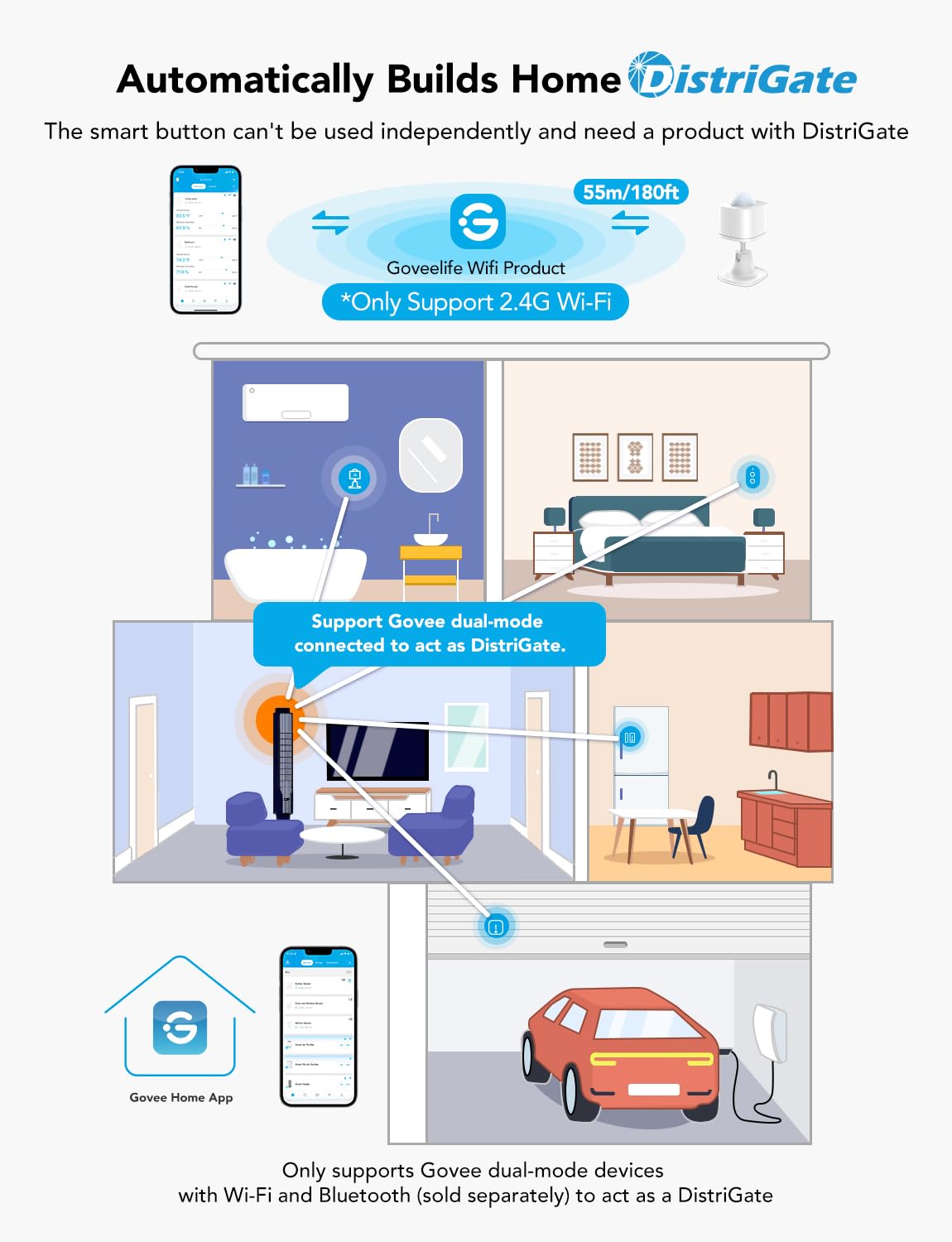 Distributed Gateway: Featuring GoveeLife dual-mode devices (sold separately) that support both Wi-Fi and Bluetooth. Only Govee Home WiFi products can interact with the H5121. Maintains an effective distance of 55m/180ft between devices and sensor. (only support 2.4G WiFi)