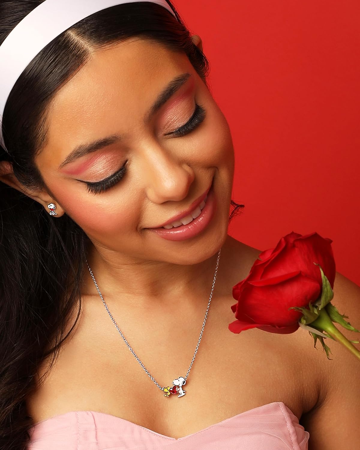Peanuts Official Snoopy & Woodstock Necklaces – Silver Flash-Plated with Red Crystal or Charm Accents, Licensed Jewelry