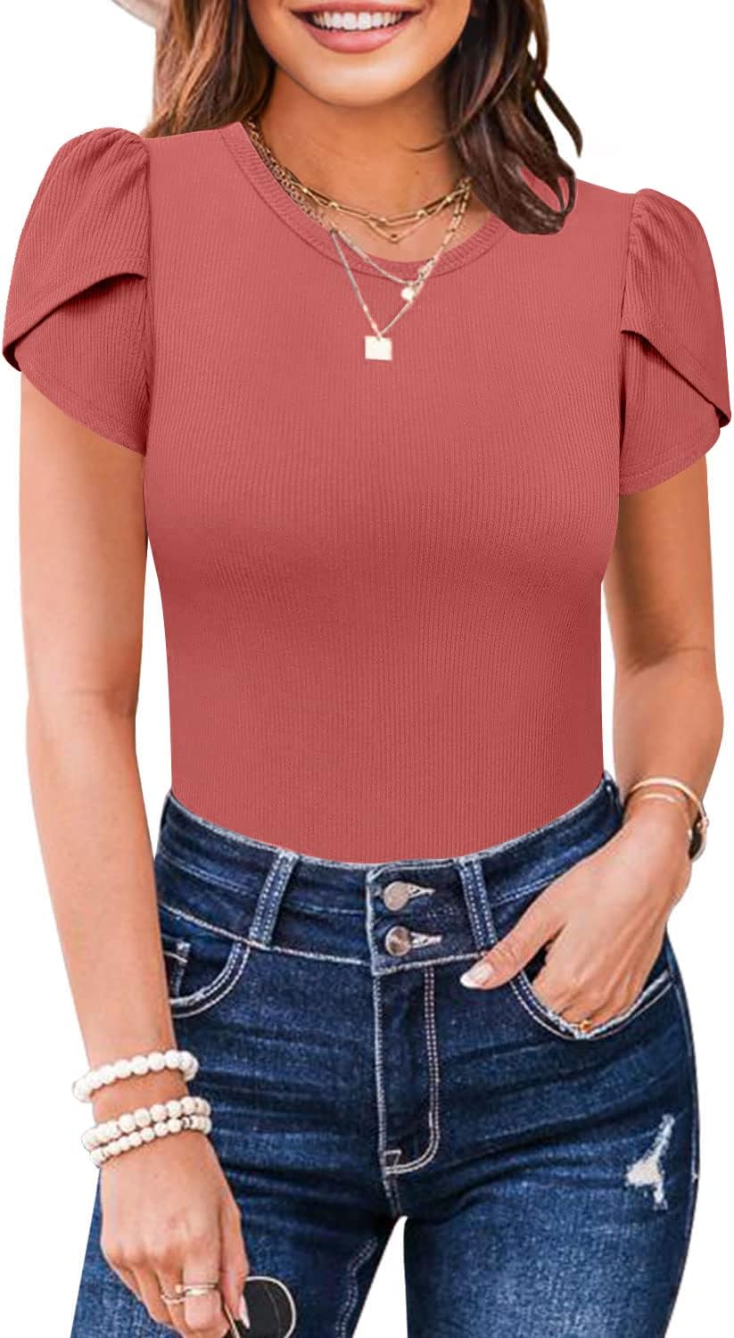 MISSJOY Womens Summer Short Sleeve Bodysuits Crew Neck Ribbed Petal Sleeve Stretchy Slim Fit Leotards Tops