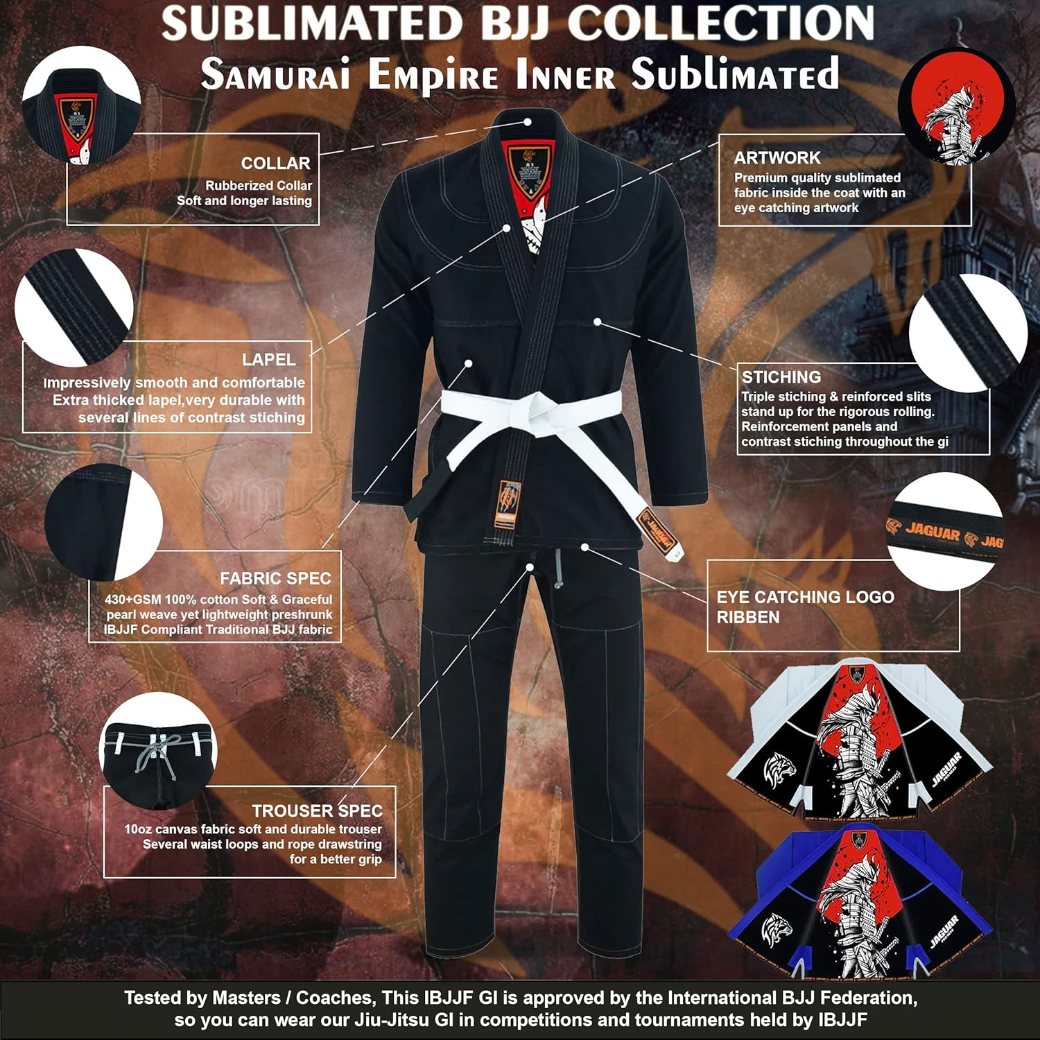 Features : - Created by, designed by and for Pro Jiu jitsu athletes - Elegant design with extra durability, - Brand patches on jacket and a unique encouraging sublimated artwork inside on breathable fabric - Optimal moisture management - 400 GSM Cotton (Pearl Weave) Jacket - 10oz Cotton Canvas Fabric Soft and Durable Lightweight Trouser - IBJJF Compliant Design - Reinforcement panels and detailed stitches with no sacrifice on quality - Several waist loops and rope drawstring for a better grip - Preshrunk for a more perfect fit - Cold water wash only and hand dry with no shrinkage - Rubberized Collars and Tapered Sleeves - Reinforced seams and stitches to provide extra strength - A free white bjj cotton belt is included in package - 30 Days Free Return - Exchange