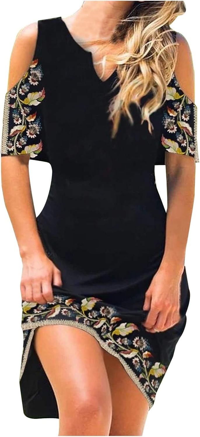 YOMXL Midi Dress for Women, Mexican Ethnic Style Embroidered Tunic Dresses Vintage Off Shoulder V-Neck Beach Dress