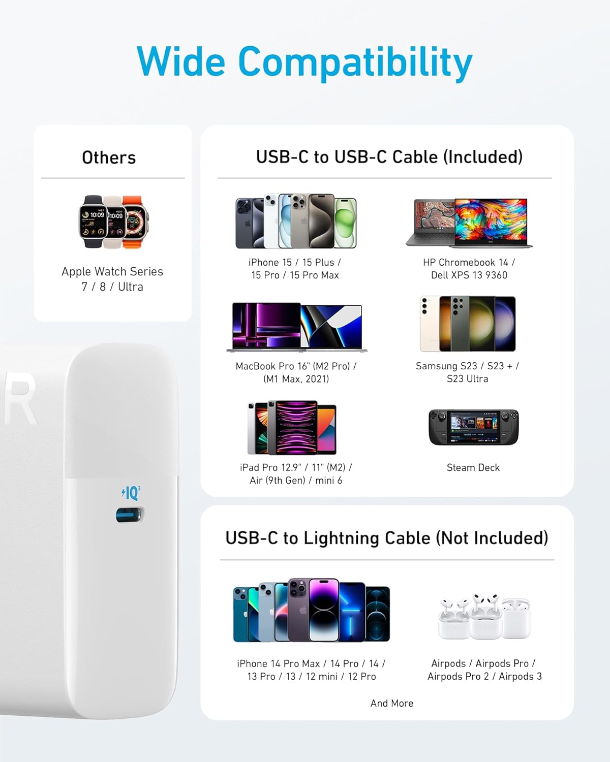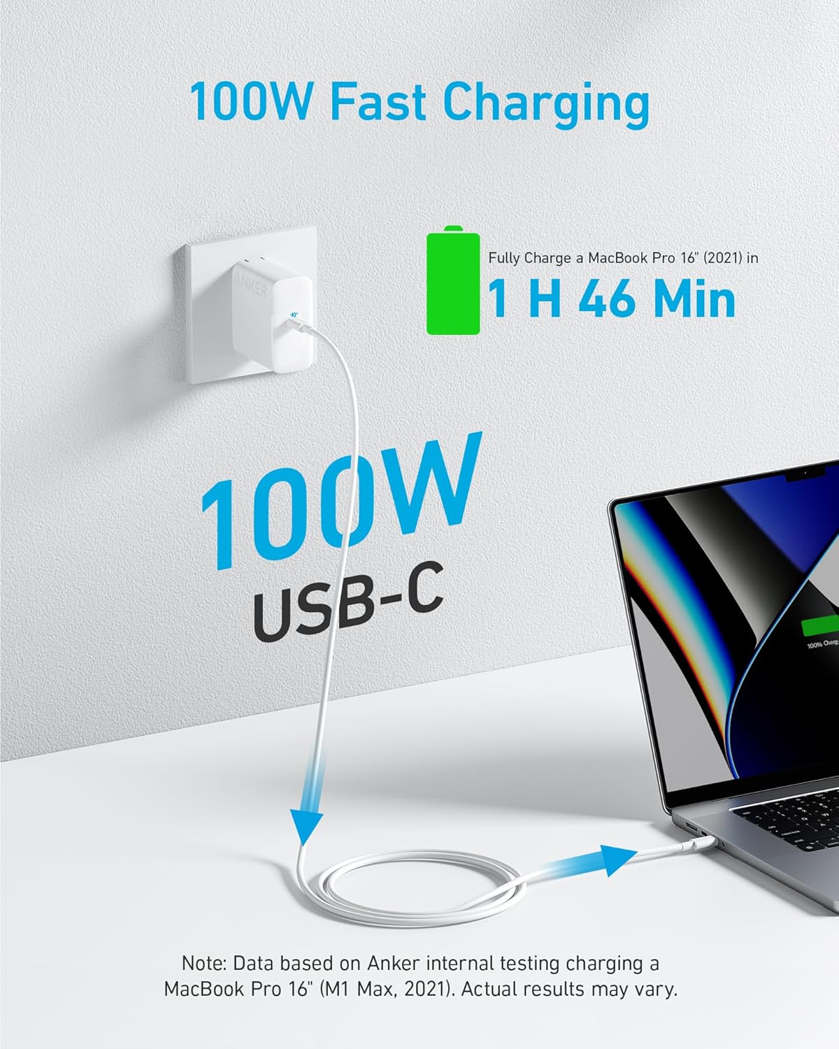 Cargador Anker para MacBook Pro, Cargador USB C Compacto y Plegable de 100W para MacBook Air, Samsung Galaxy, iPad Pro y Más, Cable USB C de 5 pies incluido