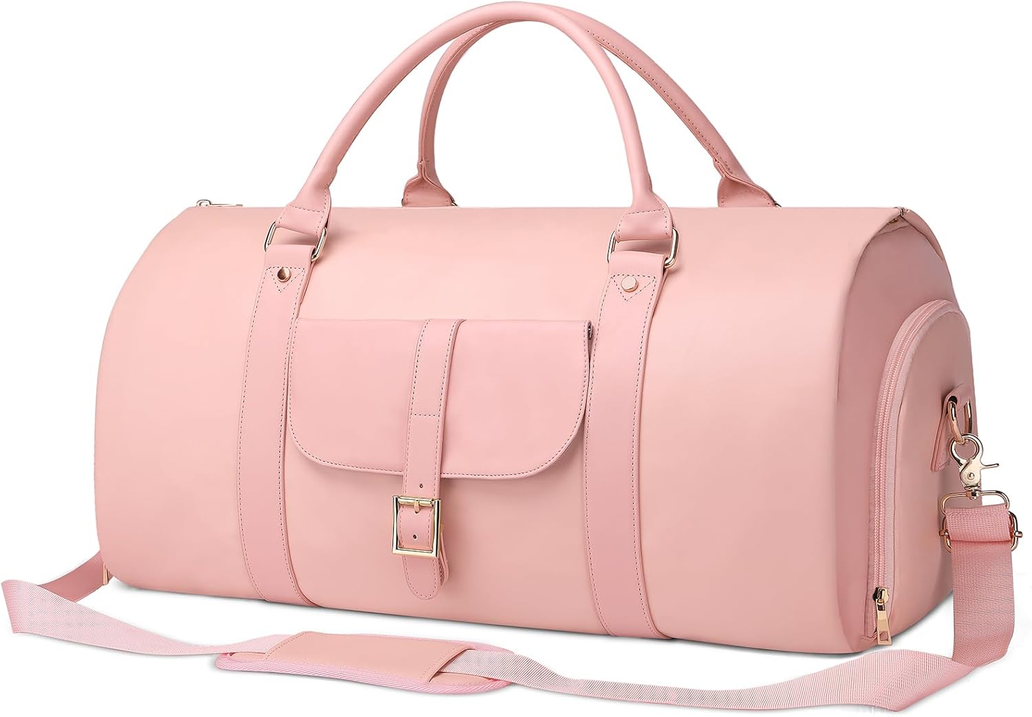 Specification: Material: PU leather. Weight: 3.9lb/0.99kg. Size: 21*13*12 inch. Opening measuring: 39"L x 22"W. Folded size: 21*11*12.5inch. Shoulder Strap with Pad:30.5~58in. Detachable and adjustable. Versatile Garment Bag for Women Multiple compartments and multiple ways of carrying make this bag versatile, it can be used as a garment bag, hanging garment duffle bag for clothes, business trip bag, weekend bag, overnight bag, beach bag, gym bag and mommy diaper bag. Perfect gift for your mother, wife, daughter, sister, friends. Perfect Travel Garment Bag 2 * Side Compartment to hold your shoes, passport, cards and pens. There is a trolley sleeve on the back of the carry on garment bag, which will make your journey more convenient and easier. Multiple Pockets Interior: Main compartment for clothes, 1* zipper compartment for silk scarves or neckties, 1* extended long compartment for suits/dresses, 3* small open pockets and 1* zip pocket for cosmetics, 1* side open pocket for toiletries. External: 1* side compartment for shoes, 1* side compartment for tickets, keys, cards and pens, front pocket for cell phone, back pocket for passport. Large Capacity With a large capacity of 45L, it can meet your 3-day travel needs, and you can put all your travel items, such as suits, dresses, clothes, shoes, computer, cosmetics, toiletries, magazines, etc.