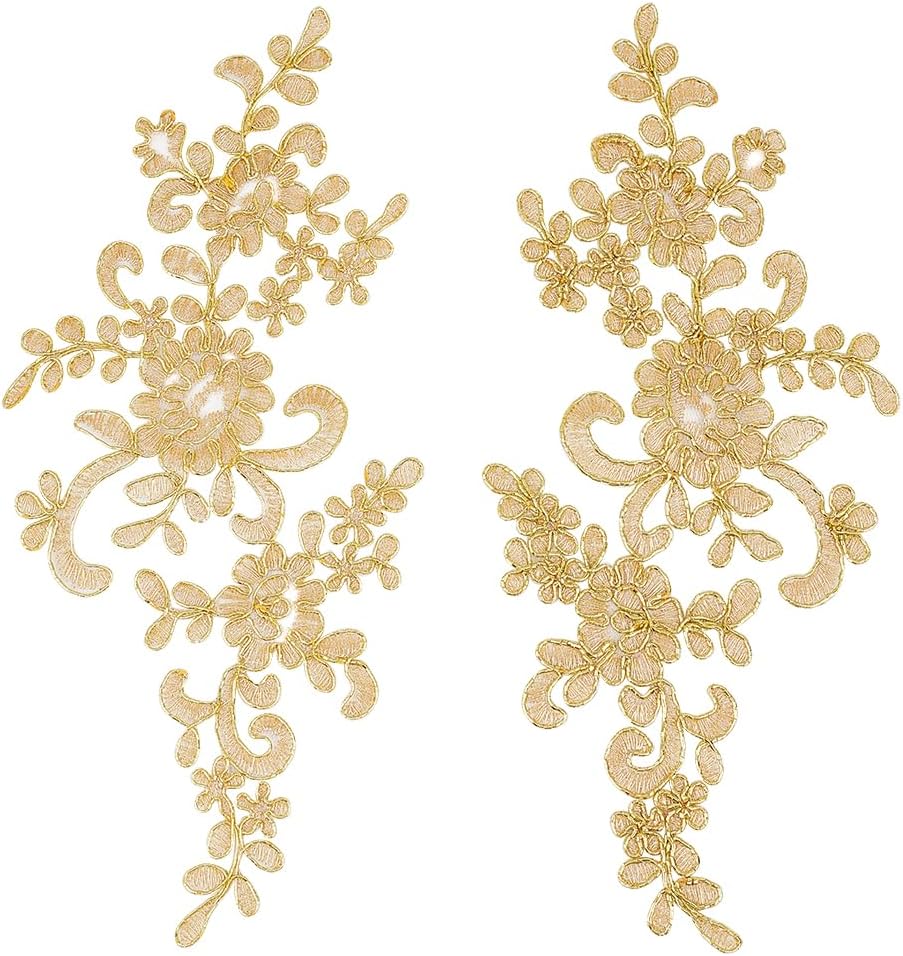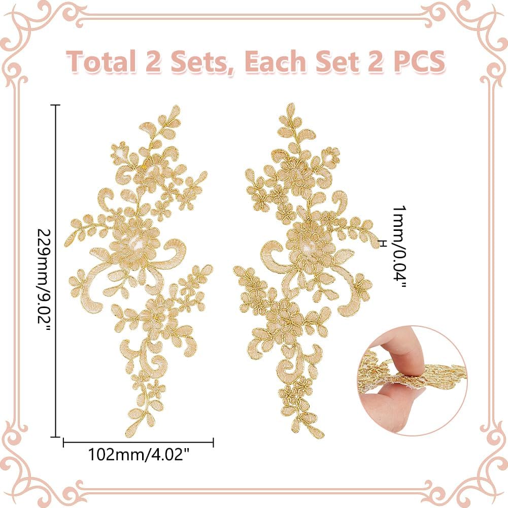4Pcs Embroidery Lace Appliques 9x4'' Golden Leaf Flowers Patches Polyester Decorative Floral Appliques Dress Gown Sewing Decorations for Fabric DIY Crafting