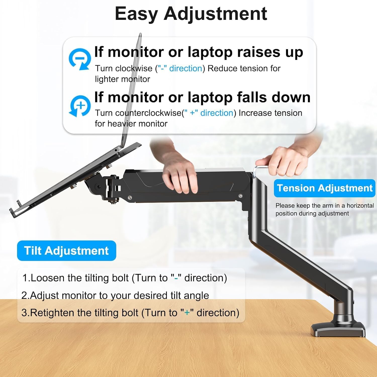 Full Motion Adjustable Laptop Stand: This monitor desk mount with gas spring arms offer a wider range of movement. Single Monitor Desk Mount arms can extend up to 21.1" long, and rise up to 16.7" in height. Easy to find the right viewing angle and position. Supports screen rotates 360° for landscape or portrait orientation, swivels 360° to share your display, and tilts up 90°/down 45° for better viewing.