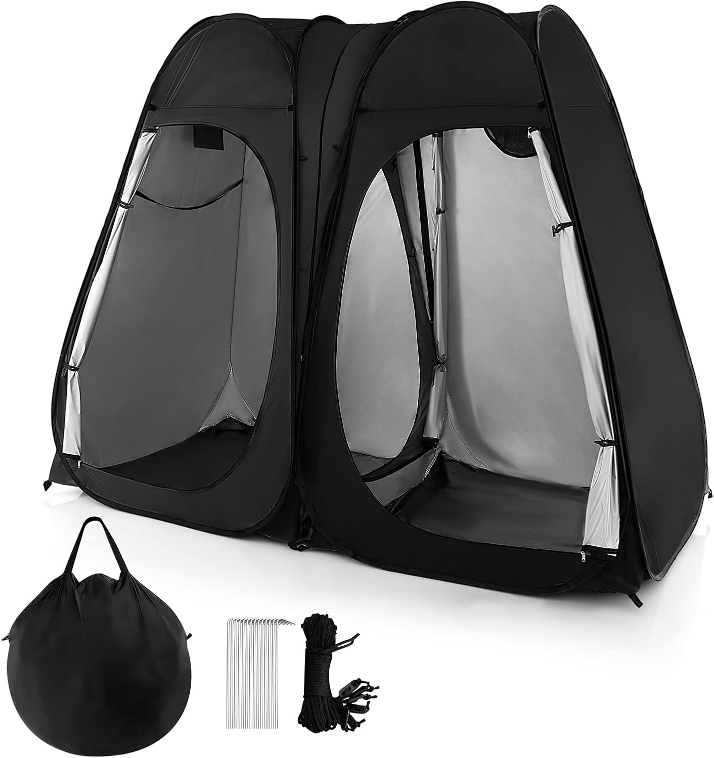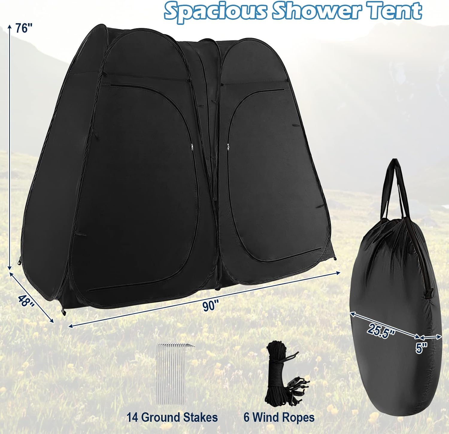 【Dividable 2 Room Shower Tent】The 90" x 48" x 76" oversized privacy tent with 2 rooms offers large space to meet your various needs as a shower tent, camping toilet, changing room.Such big size makes it tall and large for most people.Besides, the double room shower tent can be divided into 2 single room tents to for versatile use.