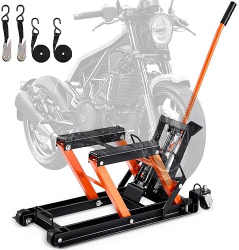 High-quality Steel Material: Made of high-strength solid steel structure and coated with a bright powder coating, this motorcycle jack is rust, corrosion, and grease-resistant, ensuring a long-term use. Neatly store it in your garage or repair shop for easy access. Get your hydraulic motorcycle jack today and make motorcycle maintenance a breeze