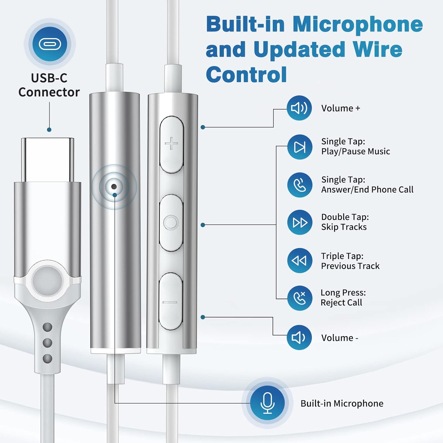 USB C Wired Earbuds for iPhone 16 15 Pro Max,iPad Pro, HiFi Stereo USB C Headphones Type C Earphones with Microphone Volume Control for Galaxy S24 S23 S22 S21 FE Flip Fold, Pixel 7a 6 5 4, OnePlus 10t