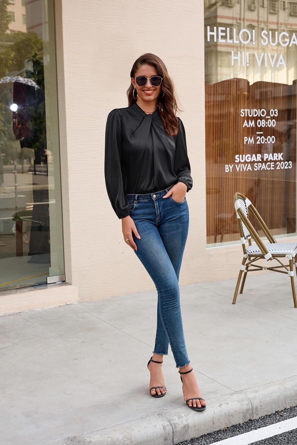 GRACE KARIN Women's Long Sleeve Satin Blouse,Mock Neck Work Silk Shirts,Dressy Tops for Business Casual Office