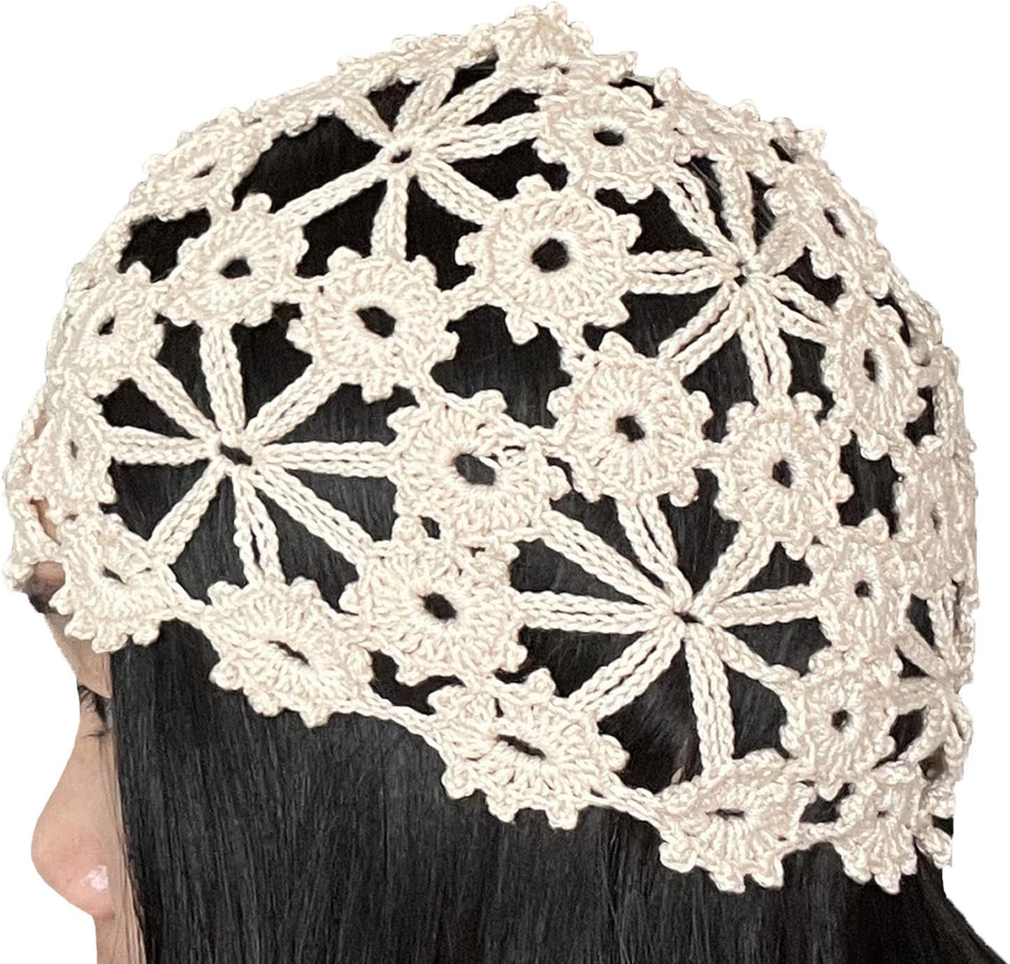 BIBITIME Women Lace Crochet Beanie Hat Handmade Knitted Cutout Floral Skull Cap
