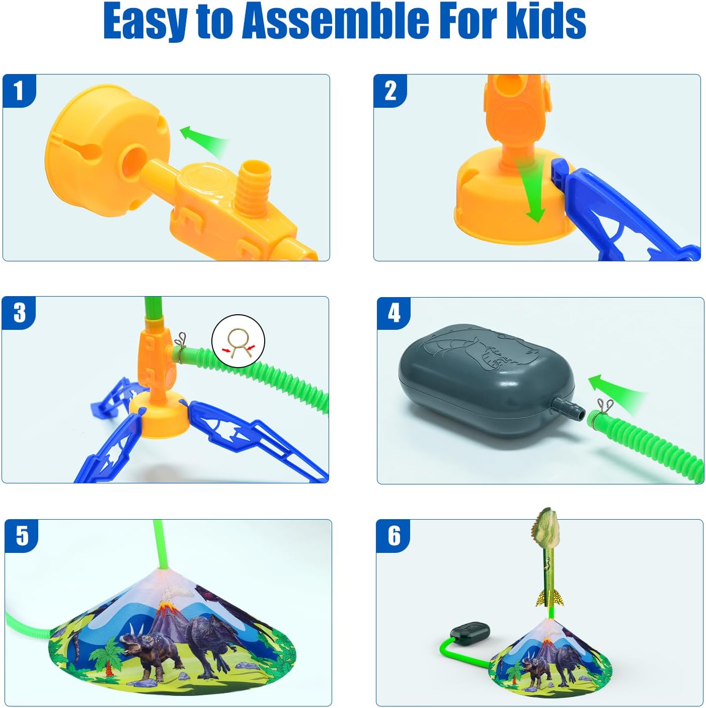Easy to Assemble and Storage: Our Dino Rocket Launcher for Kids is easy to assemble. Parents and children can build it perfectly in just minutes. Learn about hands-On ability and exercise their bodies through play, adjusting launcher tube angles and jumping force to control flight trajectories