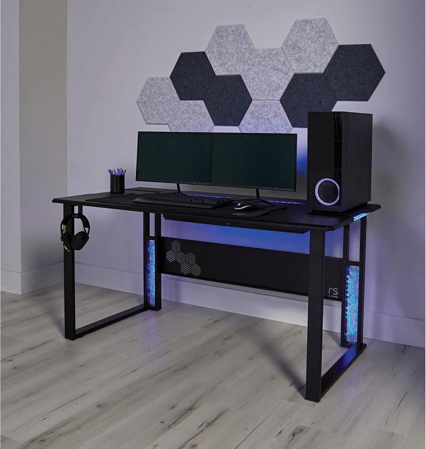 Bring your gaming experience to greater heights with the exceptional design of the RS Gaming Mergence gaming computer desk. The roomy carbon-fiber desktop of this Realspace desk gives you the space you need to set up your personal gaming preferences, while RGB lighting brings vitality to any scenario. The industrial desk features versatile cable management options, a USB hub, a headphone hook and other extras to add to your overall satisfaction. 60" wide carbon-fiber surface has a weight capacity of 176 lb (80 kg). Includes a 3-port USB 2.0 hub, and concealed, under-desk cable trays plus a full-length, rear-hinged compartment for outstanding cord management options. Remote-controlled RGB lighting on the desktop and legs has adjusting dynamic modes & speeds, color switching and adjustable brightness. Improve your sound experience with the included 10-piece hexagon acoustic panels (self-adhesive & wall mountable). Removable 38" x 13-1/2" (80 x 30 cm) mouse pad offers smooth, wide desktop coverage. Includes convenient headphone hook, cable straps and 4 leveling glides. Tested to meet ANSI/BIFMA Performance Standards - Manufacturer testing has been conducted on this product to meet specific performance requirements and safety standards set forth by the American National Standards Institute (ANSI) and the Business and Institutional Furniture Manufacturers. This product is heavy and/or oversized and may need more than one person to handle.