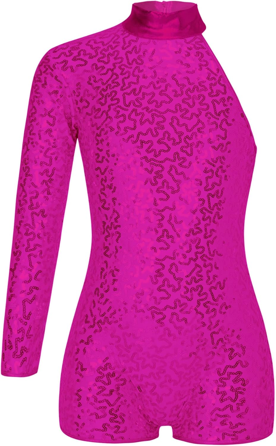 TiaoBug Kids Girls Sequins Gymnastic Leotard One Shoulder Long Sleeve Short Biketard Dance Unitard Bodysuit Jumpsuit