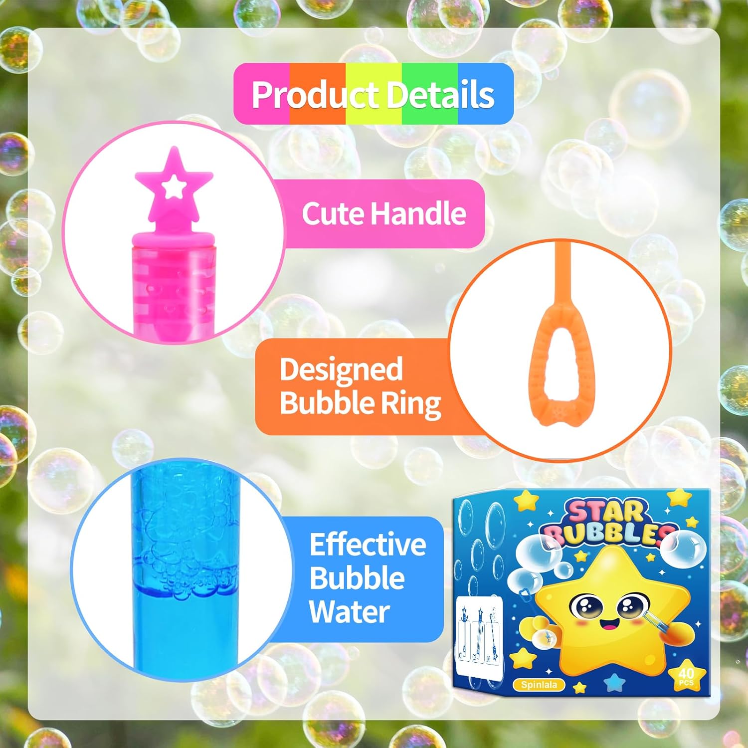 Fun Star Bubble Wands - This set includes 40 mini star-shaped bubble wands in 5 vibrant colors - green, orange, pink, blue, and yellow. Each wand is designed for easy play and creates high-quality bubbles for endless fun.